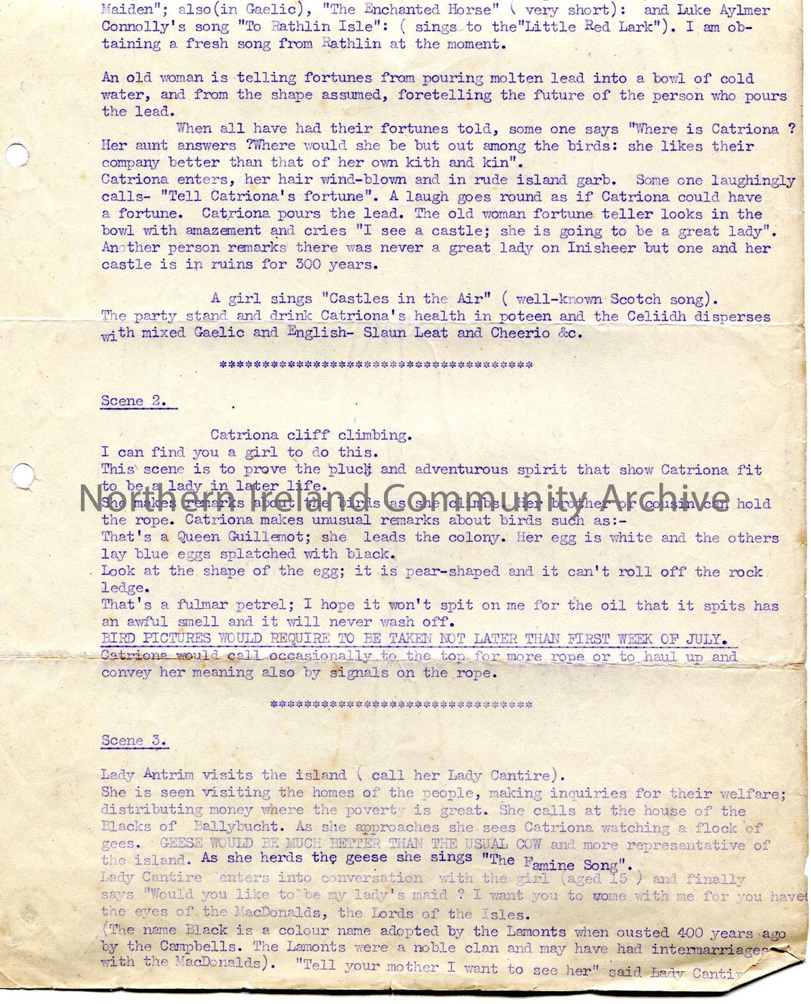 Page 1 of 4 of typed script titled, "Drowned Magpie: A Romance of Inisheer. Alternative title:- Lady Goose-Girl". Re Catriona, Lady Cantire, Sir Hugh. Script to include songs- "Ho Ro, My Nut-Brown Maiden", the Rathlin Island boat song; "The Enchanted Horse"; Luke Aylmer Connolly's song "To Rathlin Isle". 12 scenes. 'Sam Henry 6 June 1938' and 'Sandelford Coleraine 10?/1/42' written on last page.