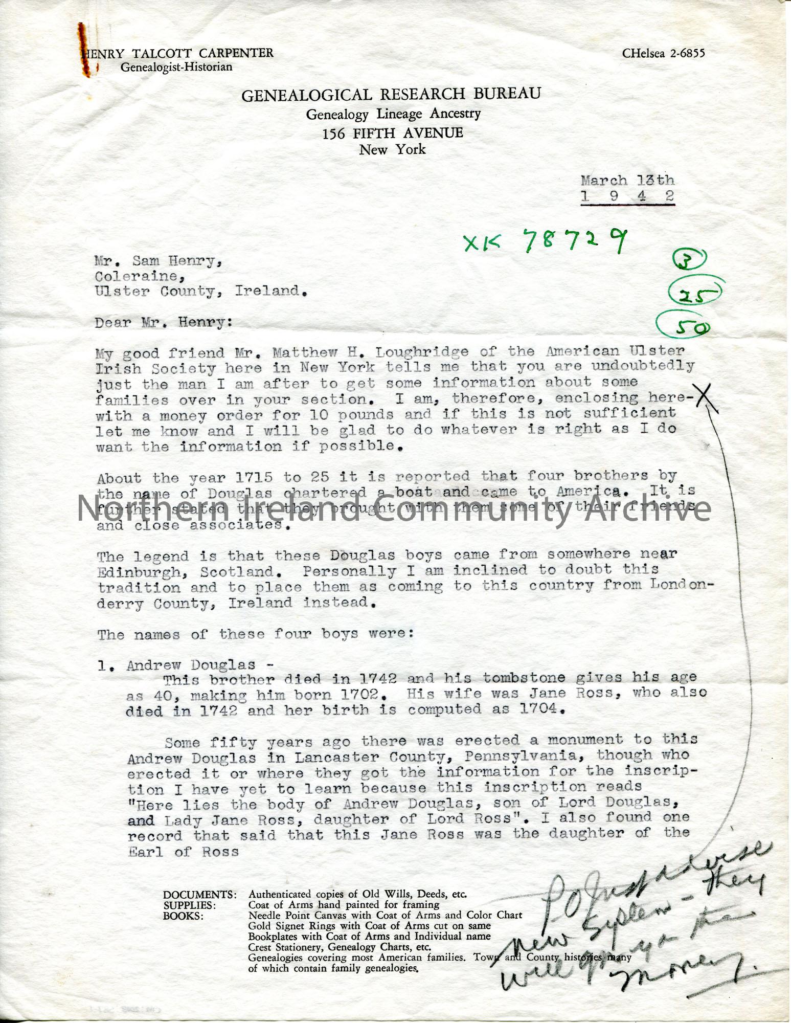 Page 1 of 4. Typed letter to Sam Henry from Henry Talcott Carpenter. Recommended Sam's services as genealogist from Mr Matthew H. Loughridge of the American Ulster Irish Society, New York. Re 4 brothers of the name Douglas and their departure to America 1715-1725 - Andrew, Archibald, James and Thomas Douglas. They are believed to have settled in Maryland then Pennsylvania. He has noted the names in Wills in the index of Londonderry County and asks Sam to help identify any connections to those who settled in America with surnames Lyttle, Douglas and Ross. Also asks Sam to research the will for the name Houston and Buchanan.