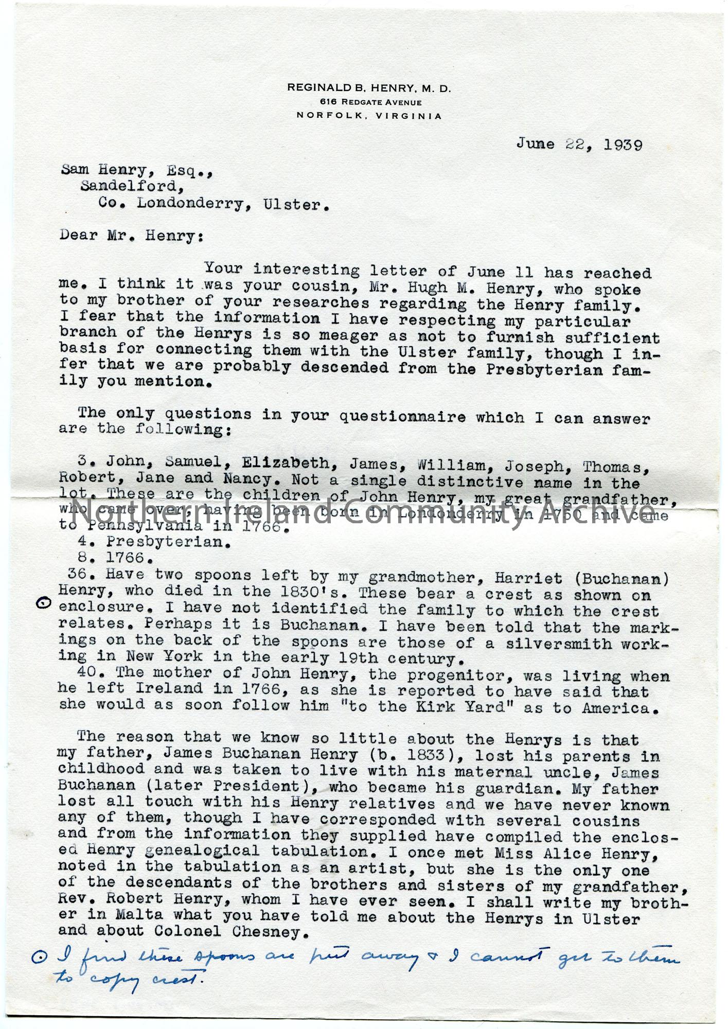 Page 1 of 4. Typed letter to Sam Henry re genealogy of Buchanan and Henry families. Sam to try and connect the Henry family in America to Ulster. Incl…