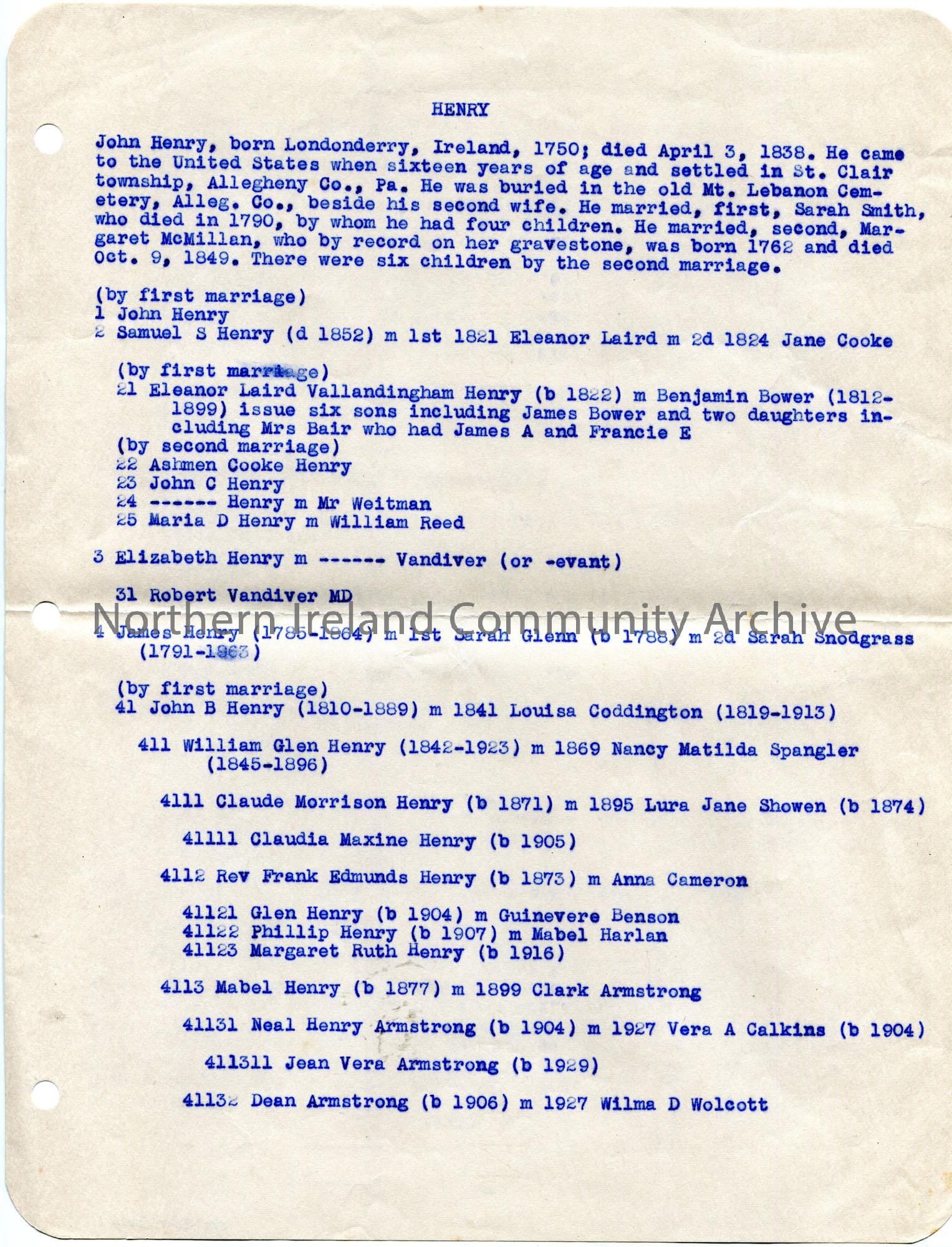 Page 1 of 4. Typed tabulation of the Henry family lines in America by Reginald B Henry for Sam Henry.