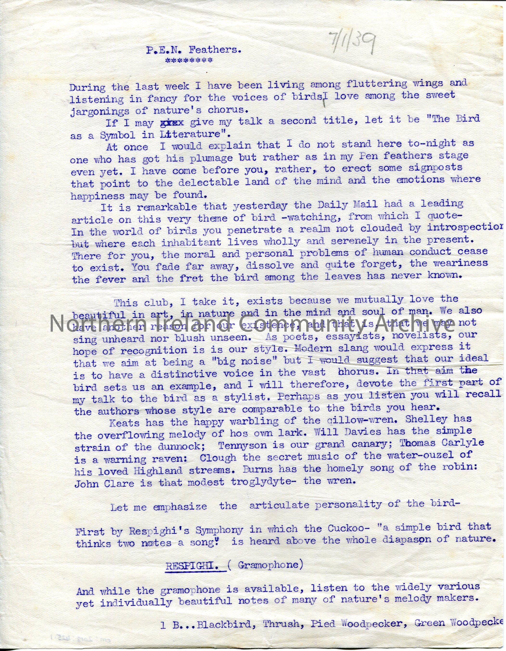 Page 1 of 4. Typed talk by Sam Henry titled, 'P.E.N. Feathers'. Dated 7th January 1939. To Birds PEN Club. Gives the talk a second title of 'The Bird as a Symbol in Literature.' Used gramophone in talk to play bird song. Gives details of books which inspired him when he was younger re birds, poetry, music. Refers to visits to Selborne, Chalfont St Giles, Lake District, Shropshire, New England Emerson County, Philadelphia. Mentions S B Langlands, Gas Manager of Coleraine.