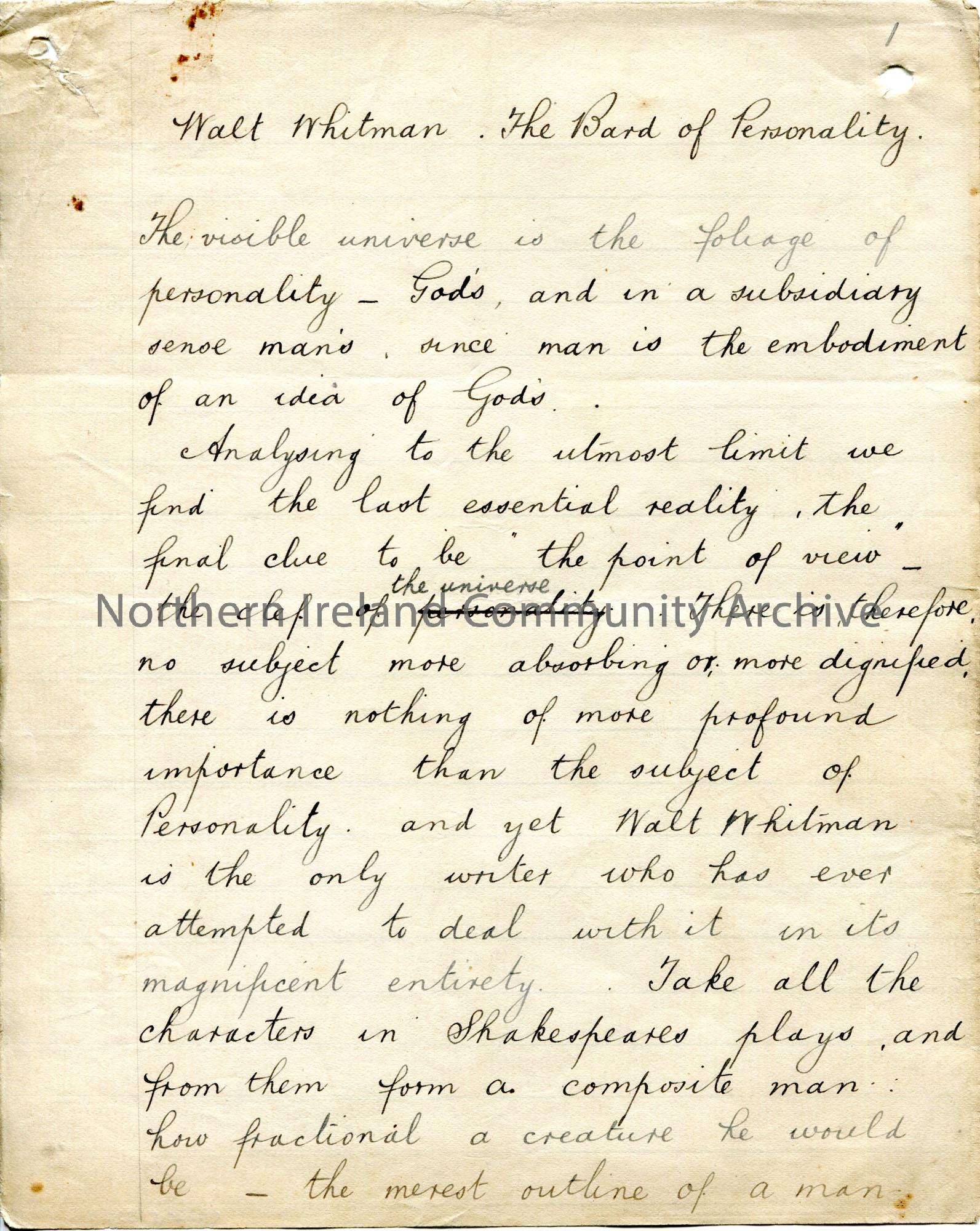Page 1 of 43. Handwritten essay by Sam Henry titled, ‘Walt Whitman. The Bard of Personality’. Short biography of Whitman and discussion of his poetry.
