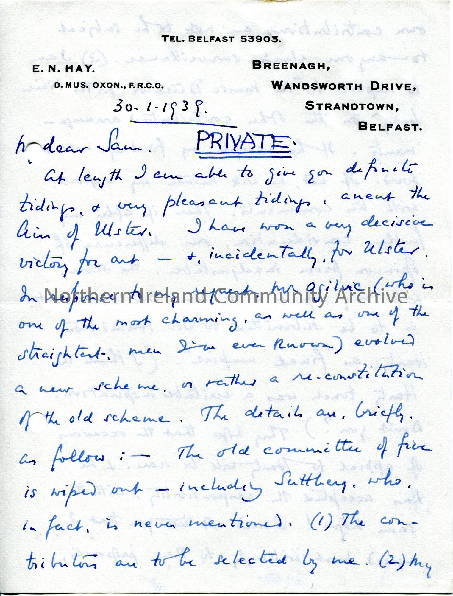Page 1 of 5. Handwritten letter (first four pages double sided) to Sam Henry. Marked as private. Writing re the reconstitution of the Airs of Ulster scheme at the B.B.C. Mentions people - Sutthery, Brennan and Redmond Friel, Joan Trimble, Ogilvie, Jacobson. Also writes re the publishing of a book. Himself and Hessie attended the Ideal Home Exhibition and met Sam's uncle, Mr Davis.