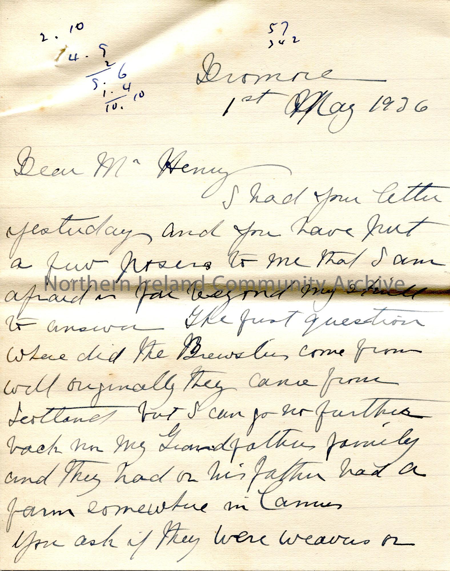 Page 1 of 5. Handwritten letter Sam Henry from M. Brewster. Answering some questions for Sam re the family Brewster.