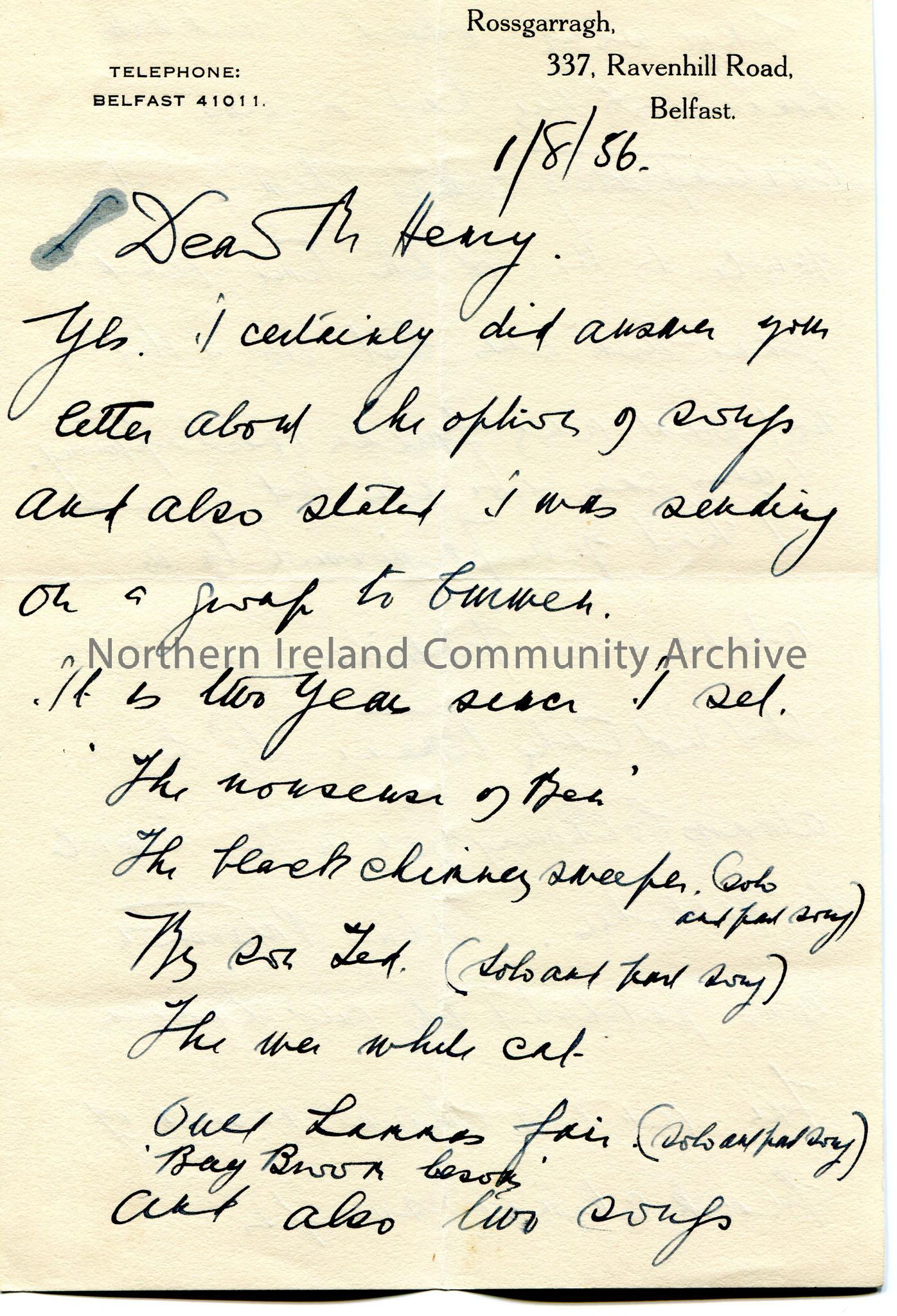 Page 1 of 5. Handwritten letter to Mr Henry. Appears to be contacting publishers re music arrangements of songs given by Sam. Recalls [Maurice] Jacobson having seen Sam in Coleraine re 'The White Cat'.