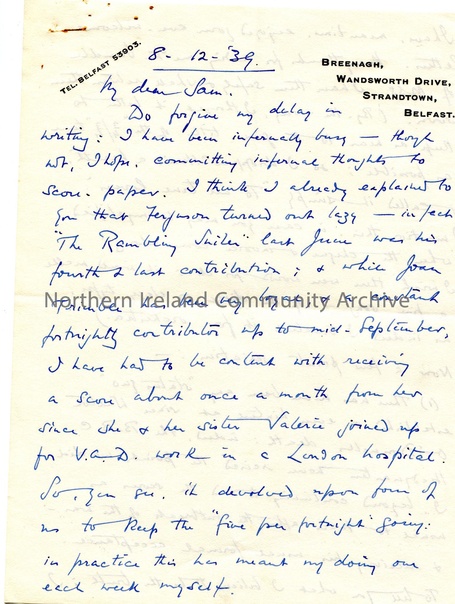Page 1 of 5 handwritten letter to Sam Henry. Writes about compiling songs for publication. Refers to BBC.