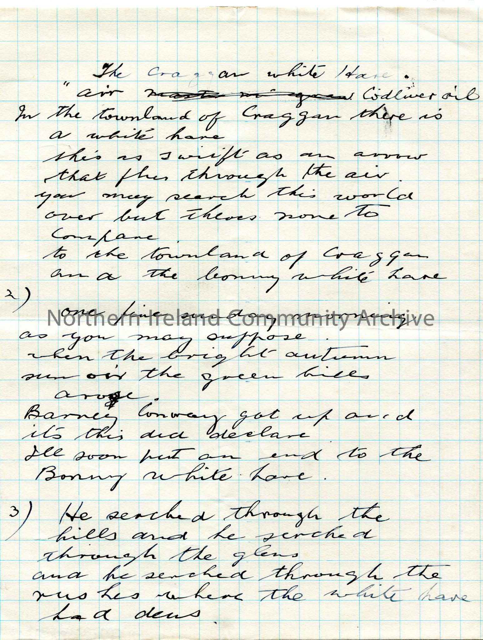 Page 1 of 5. Handwritten words to songs. ‘The Craggan White Hare’ four verses. Second song about Eddie McGurk, five verses.