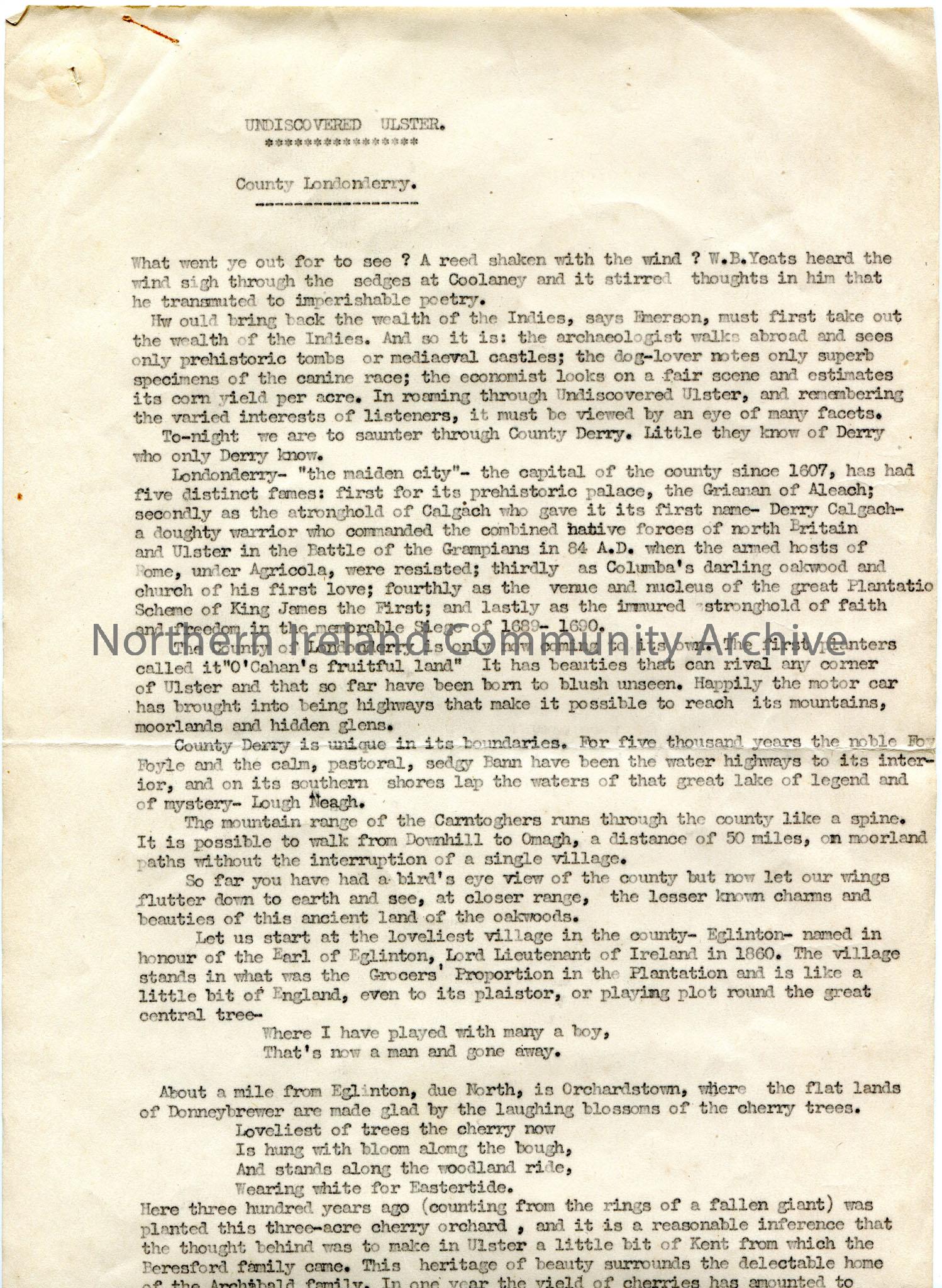 Page 1 of 5 of typed broadcast. Titled, ‘Undiscovered Ulster. County Londonderry’. Descriptive hi…