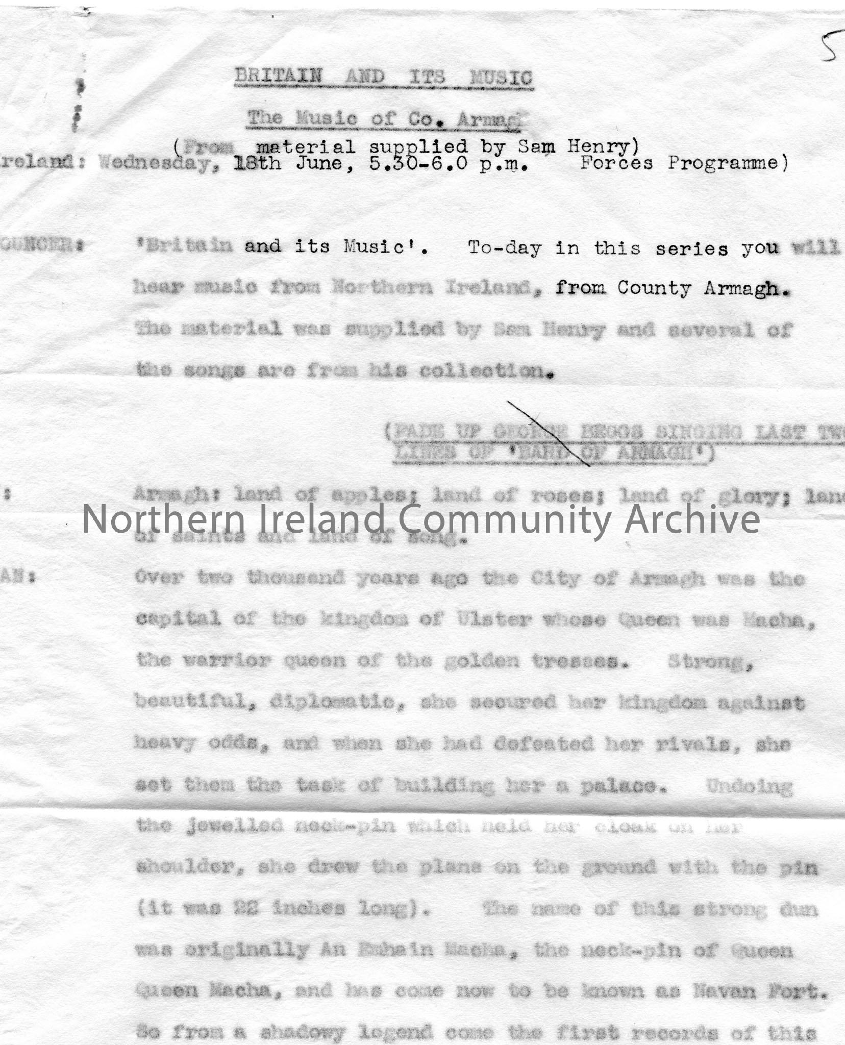 Page 1 of 5 of typed script titled, ‘Britain and Its Music, The Music of Co.Armagh. From material supplied by Sam Henry’. Took place in Northern Irela…