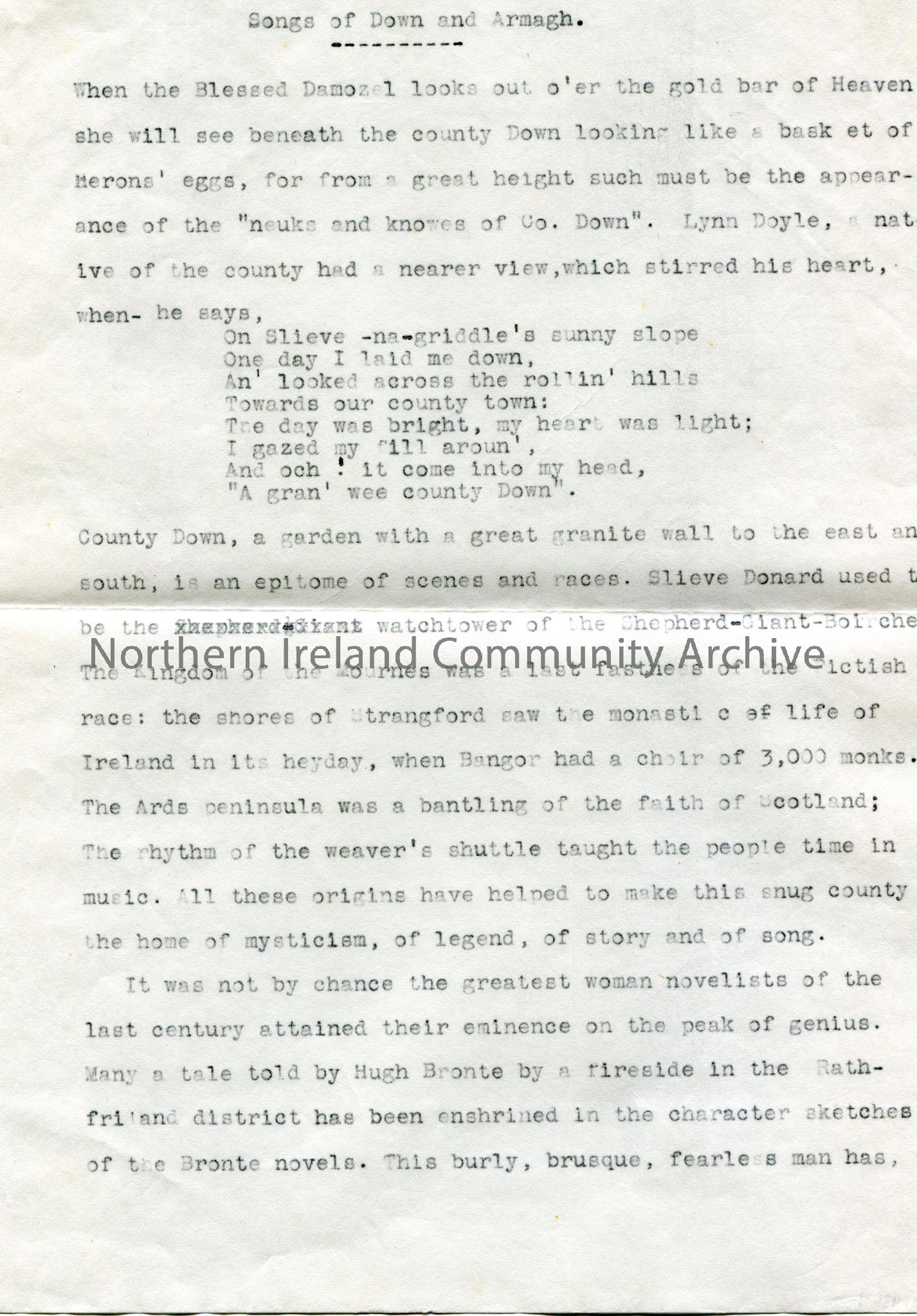 Page 1 of 5 of typed script titled, ‘Songs of Down and Armagh’. Re songs and their connections to the areas. Mentions Portaferry, Ards peninsula, Newr…