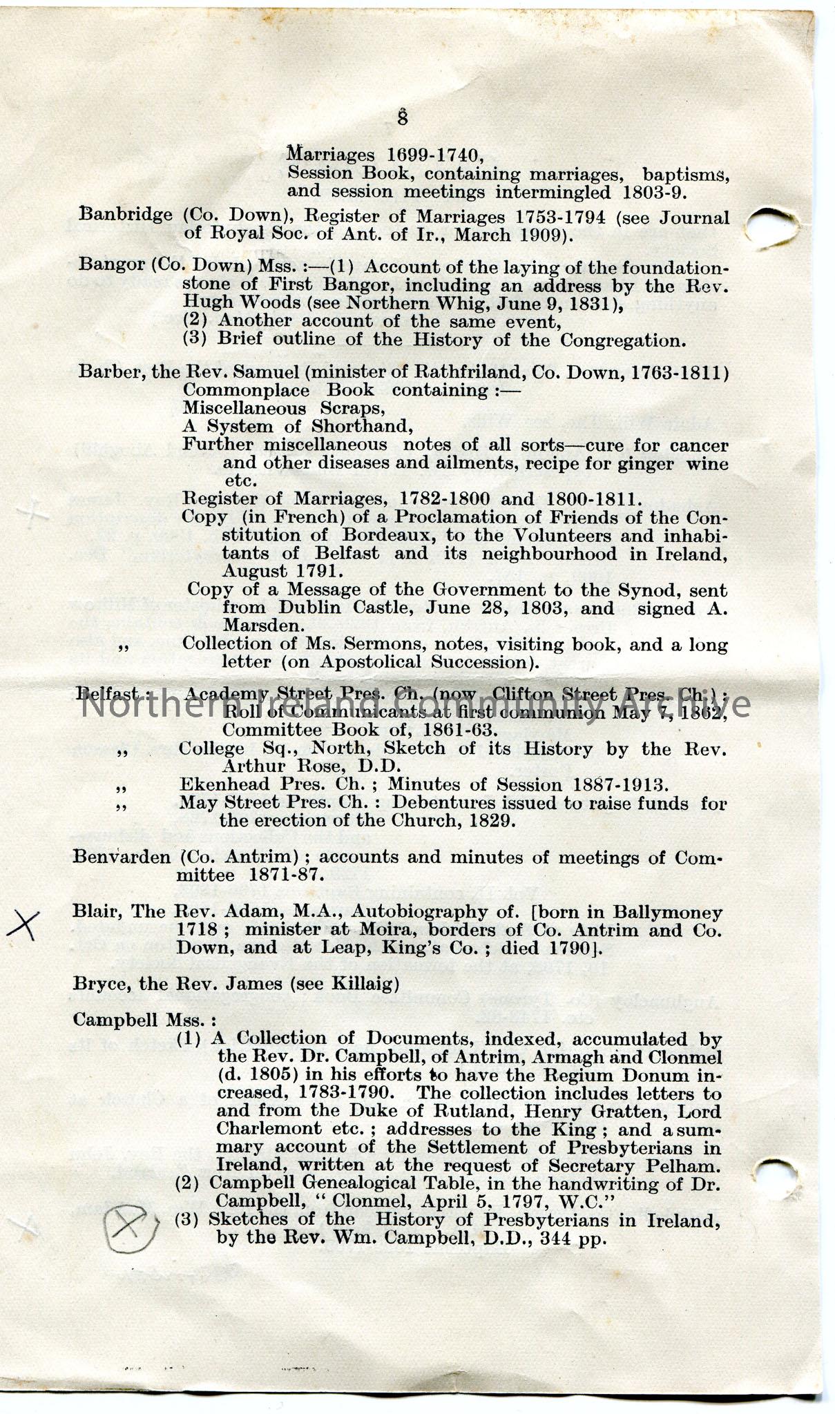 Page 1 of 5. Pulled page from what appears to be a publication of the Presbyterian Historical Society. Pages 7-16 printed on both sides. Printed by 'The Tyrone Printing Company, Ltd., Dungannon'. Re 'Catalogue of the MSS.' List of person names and places in alphabetical order. Mentions Coleraine. Marked in pencil throughout pages.