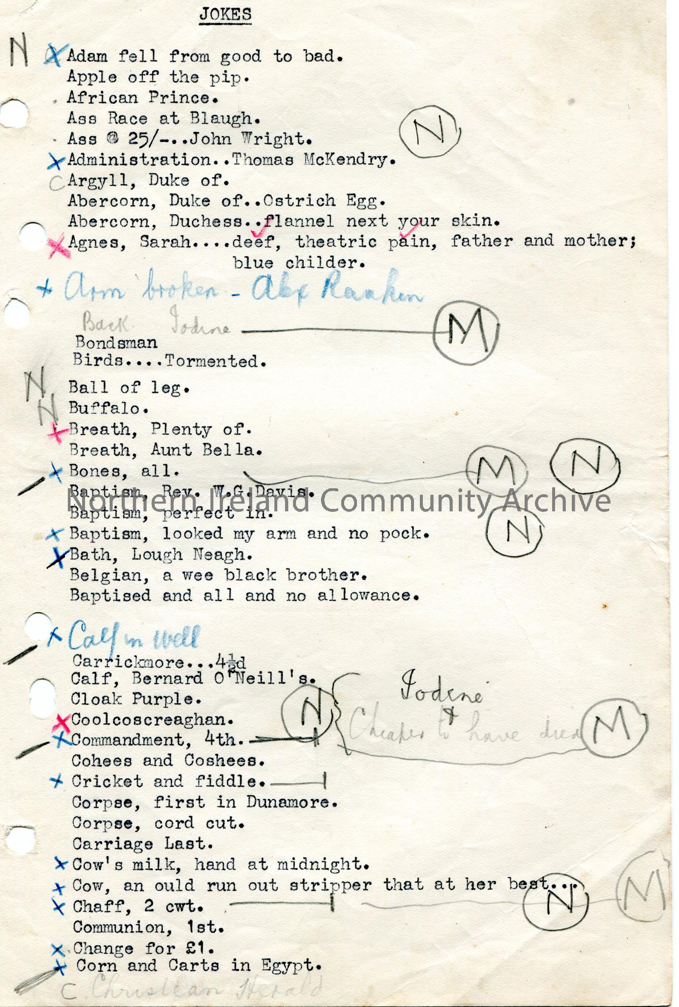 Page 1 of 5 typed list of jokes in alphabetical order – A-C, titled ‘Jokes’.