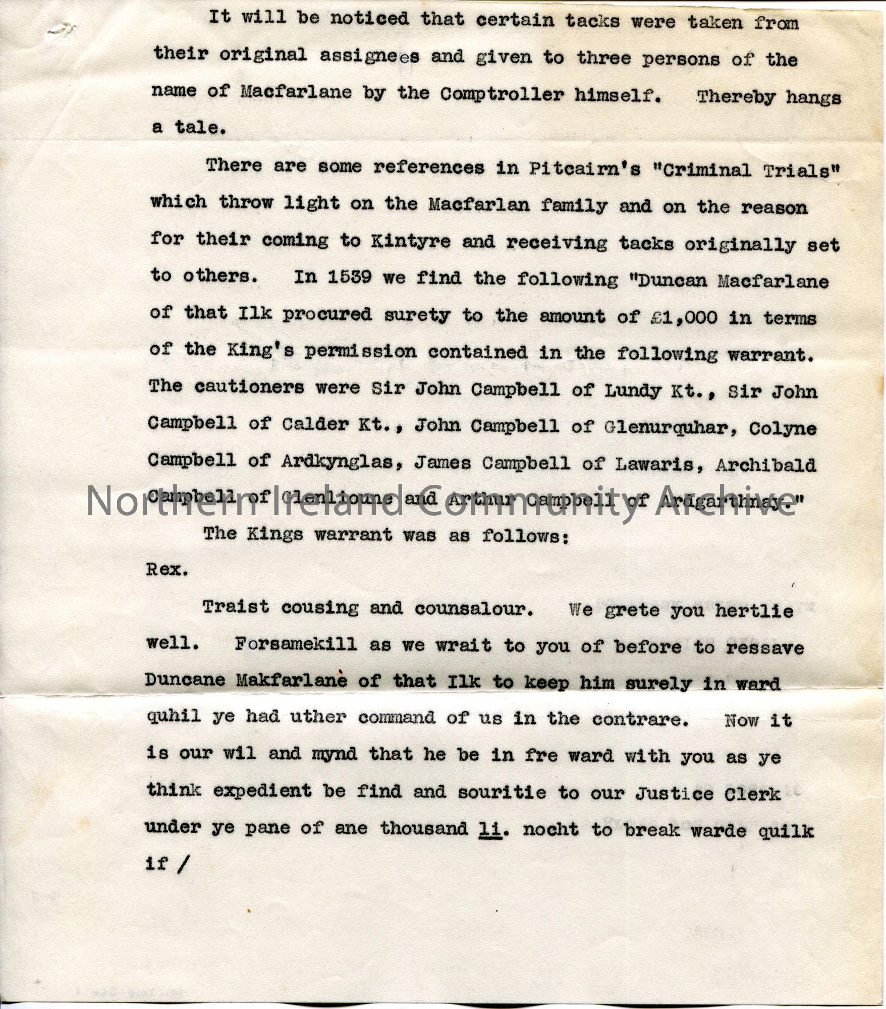 Page 1 of 5. Typed notes re MacFarlane's of Scotland and cost of land rent in 16th century Scotland. [CM:2018:564 states that Sam wrote an article re the MacFarlane's for a 'Coleraine paper'].