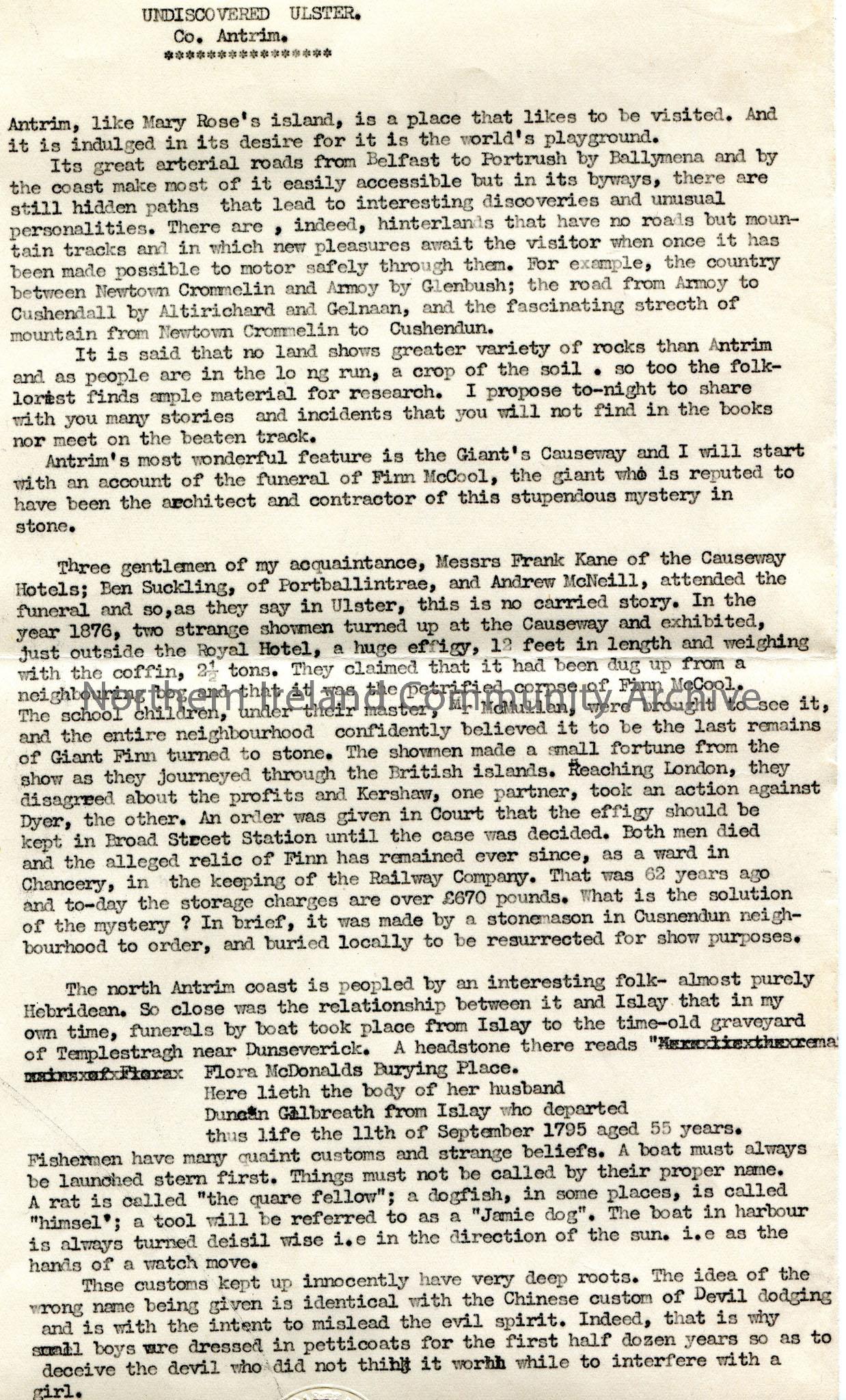 Page 1 of 5. Typed script for broadcast titled, 'Undiscovered Ulster. Co. Antrim.' Re stories of the history of places and people in Co. Antrim. Refers to towns which have become famous through songs - Coleraine, Limavady, Claudy and Ballycastle. Mentions Glens of Antrim, Glenariffe, Galbally, Cairncastle, Ballykeel graveyard, moorland between Larne and Ballymena, Glenwherry, Doagh, Glenavy and Portrush. Refers to archaeology, witches, fishing and Finn McCool.