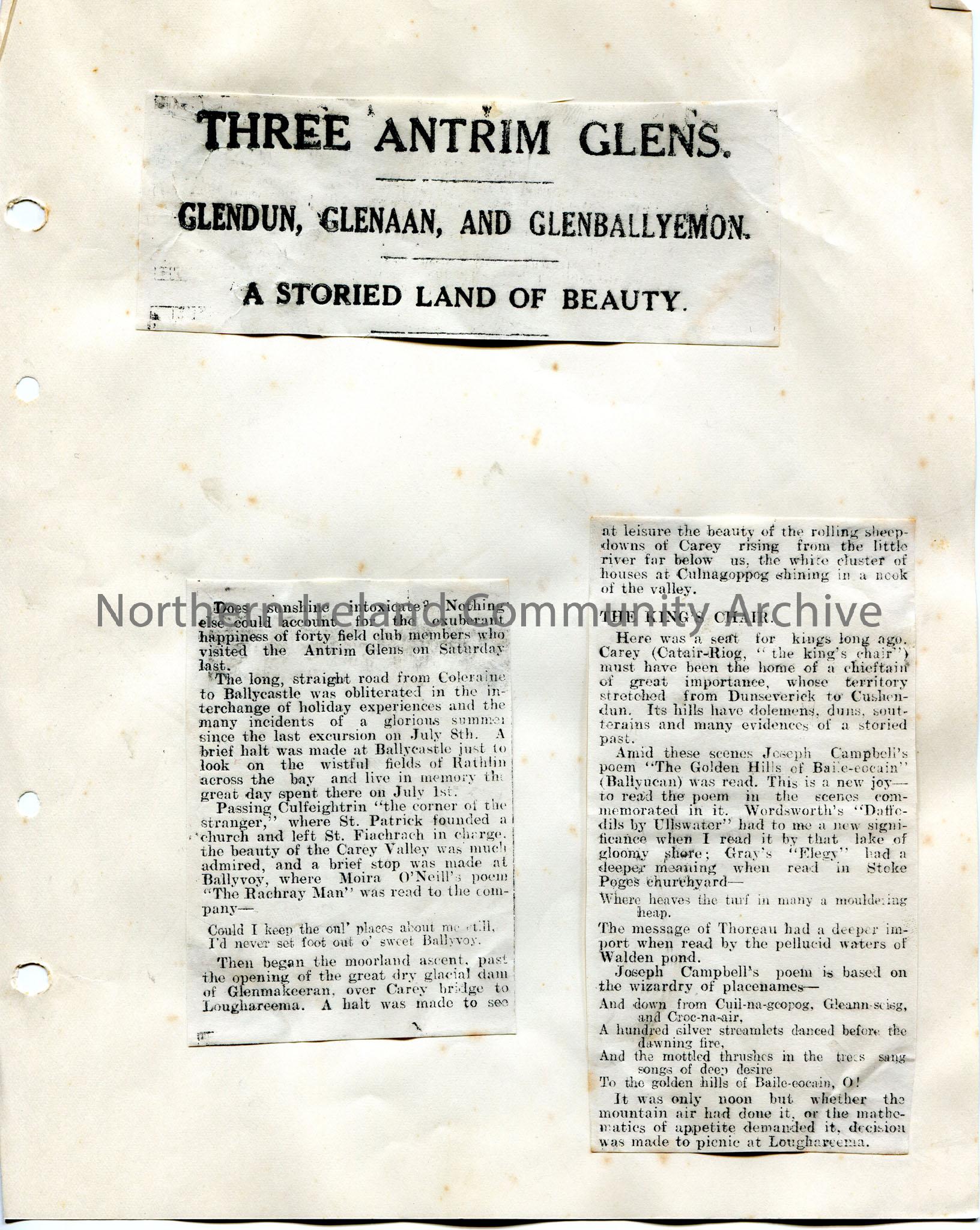 Page 1 of 6 of newspaper cuttings stuck to paper titled, ‘Three Antrim Glens. Glendun, Glenaan, and Glenballyemon. A Storied Land of Beauty.’ Details …