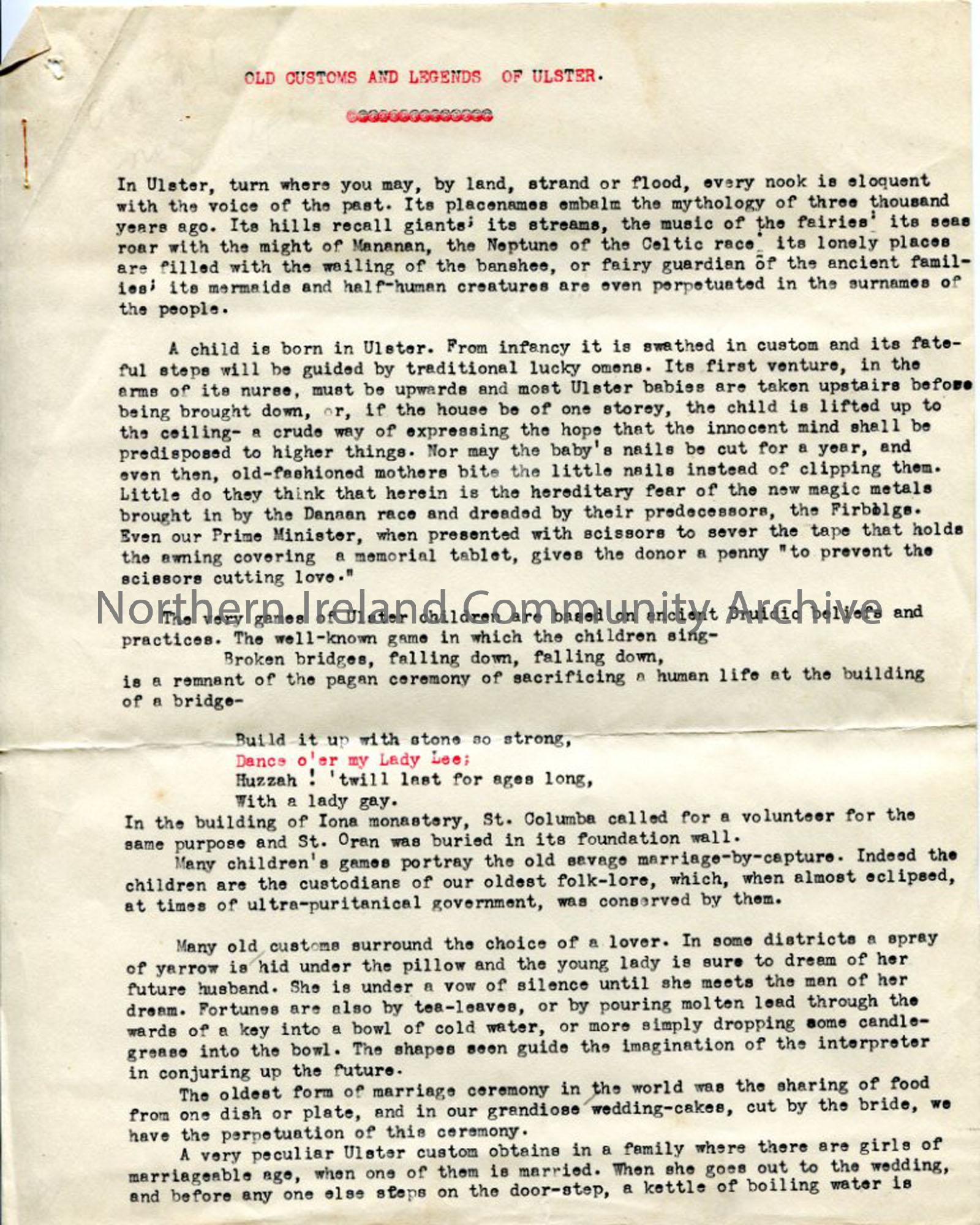 Page 1 of 6 typed pages of script for the broadcast 'Old Customs and Legends of Ulster', sent out across USA and Canada - folklore stories, saints, cures for disease, traditional practices.