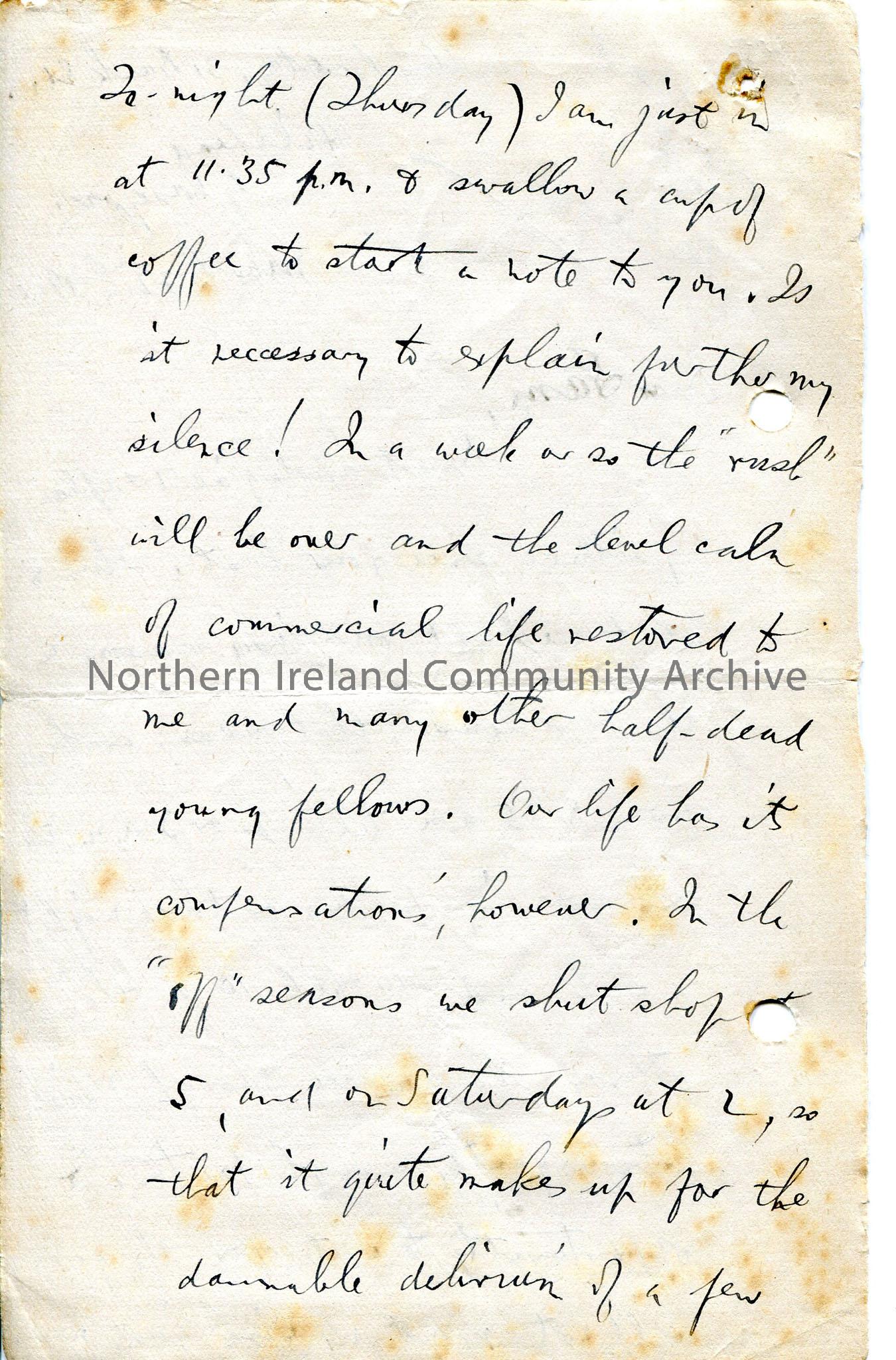 Page 1 of 6 page handwritten letter, on both sides of paper. Discusses his working hours, then a love of nature shared with Sam - elaborates, describing walks e.g. from Cranagh to Barmouth and the sights and sounds along the way