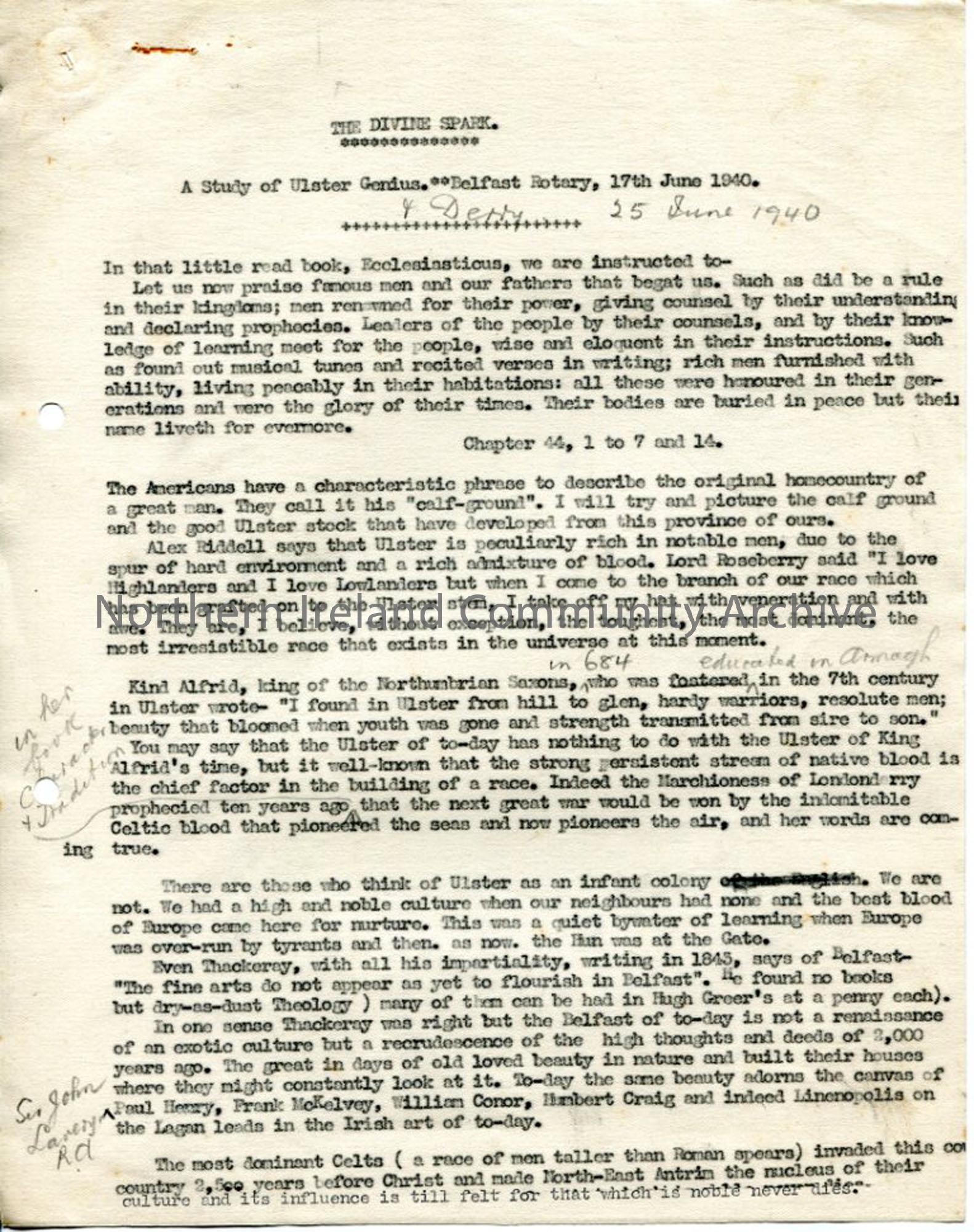 1 of 6 typed pages of script, with added handwritten notes, under heading 'The Divine Spark - A Study of Ulster Genius' - for talk given to 2 Rotary Clubs. Deals with kings of ancient past, saints of Golden Era, politicians, officers, actors, artists, poets, music - occasional poem included. Dated 17.6.1940.