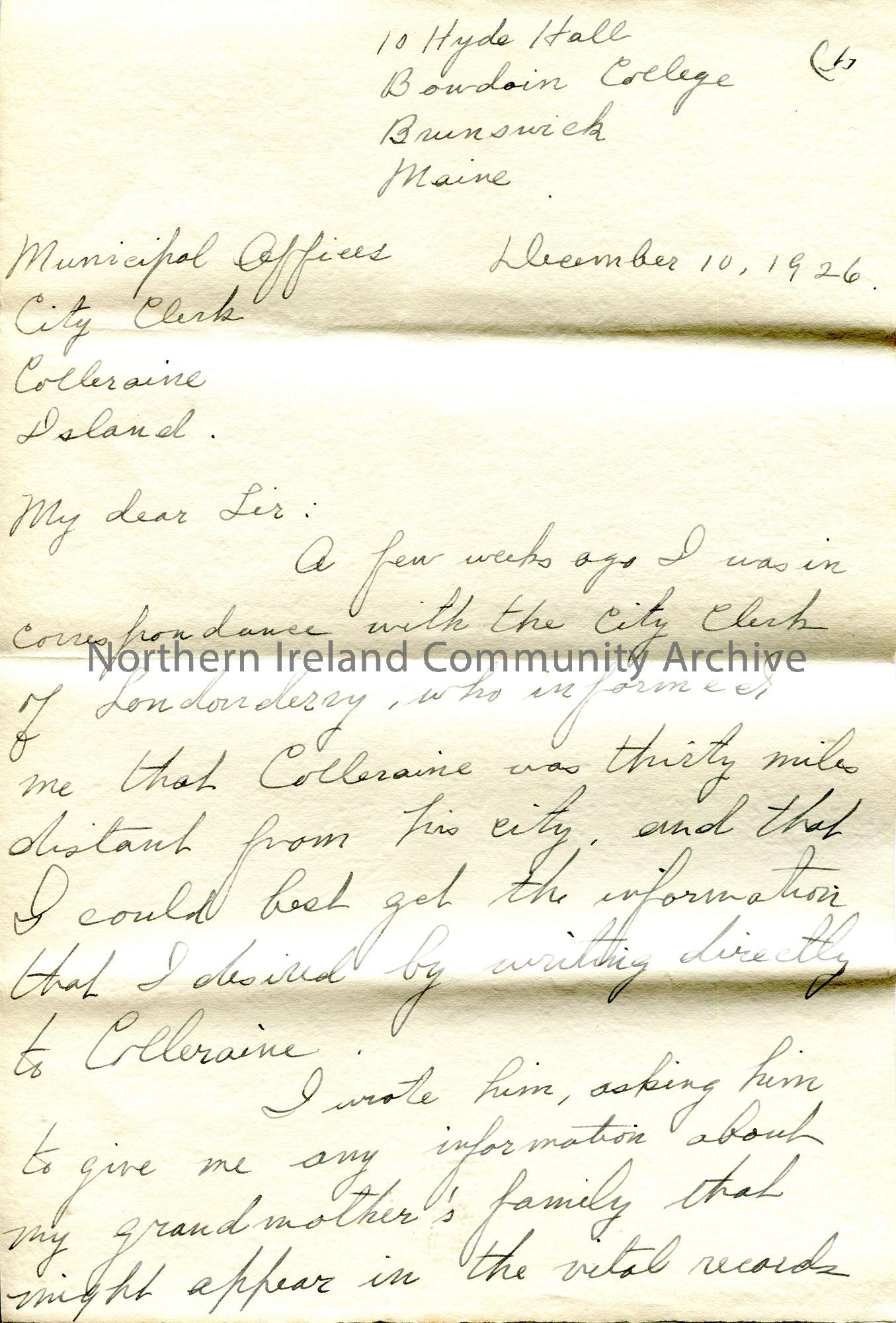 Page 1 of 7. Handwritten letter to City Clerk, Coleraine from Leon Milliken. Asking for help in finding family history information on the Cuthbert family who came from Coleraine and emigrated to America.