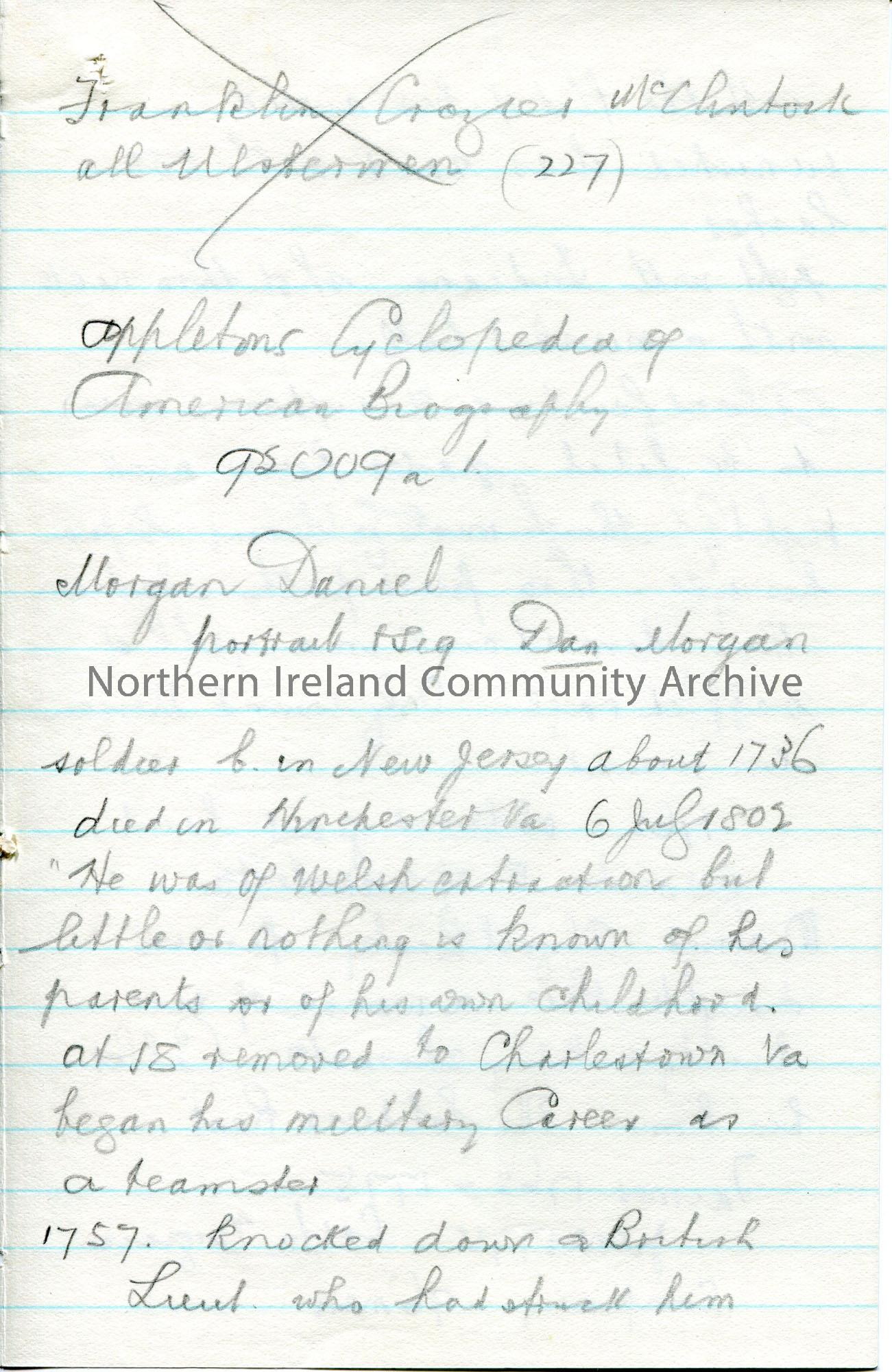Page 1 of 7. Handwritten notes (double sided) in pencil on lined paper taken from a notebook re General Daniel Morgan, America.