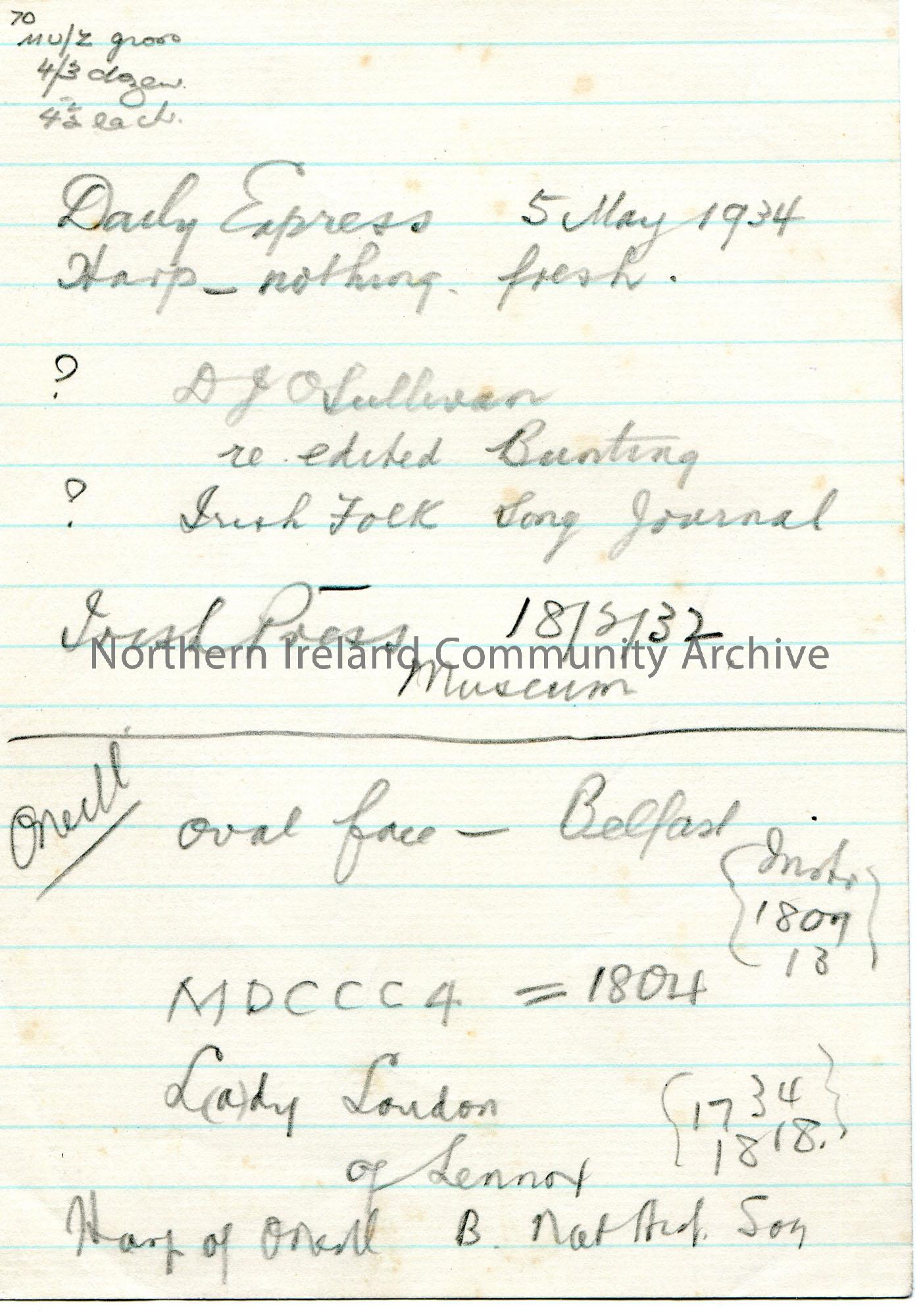 Page 1 of 7. Handwritten notes in pencil on lined paper. Not in context. Re surnames O’Neill, McDonald, O’Kane; harp.