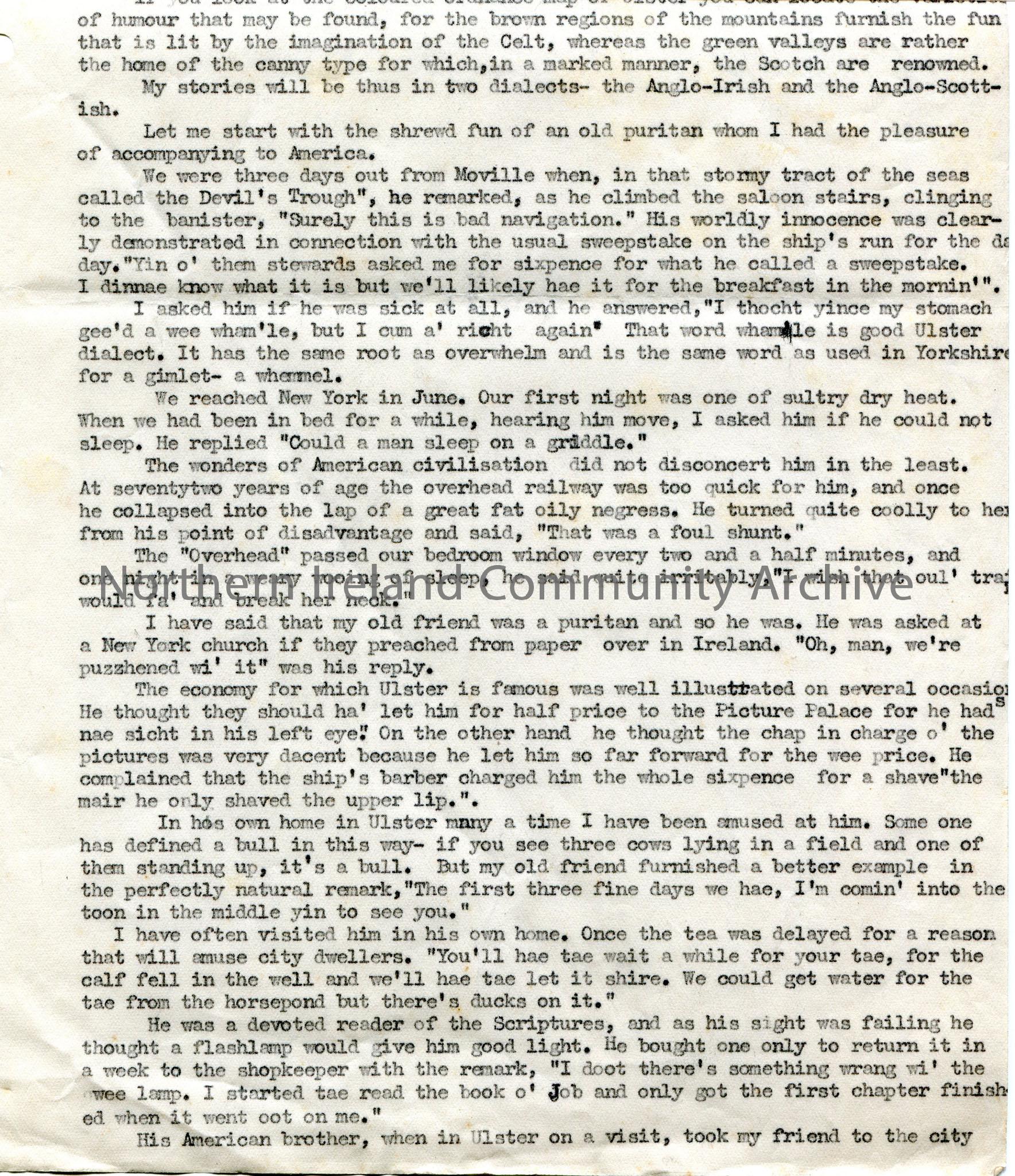 Page 1 of 7 of typed talk for broadcast titled, 'Wit on the Wireless; a Radio Talk given from Northern Ireland on 7th September 1925'. Humorous talk re stories and folklore in Ulster, spoken in Anglo-Irish and Anglo-Scottish.