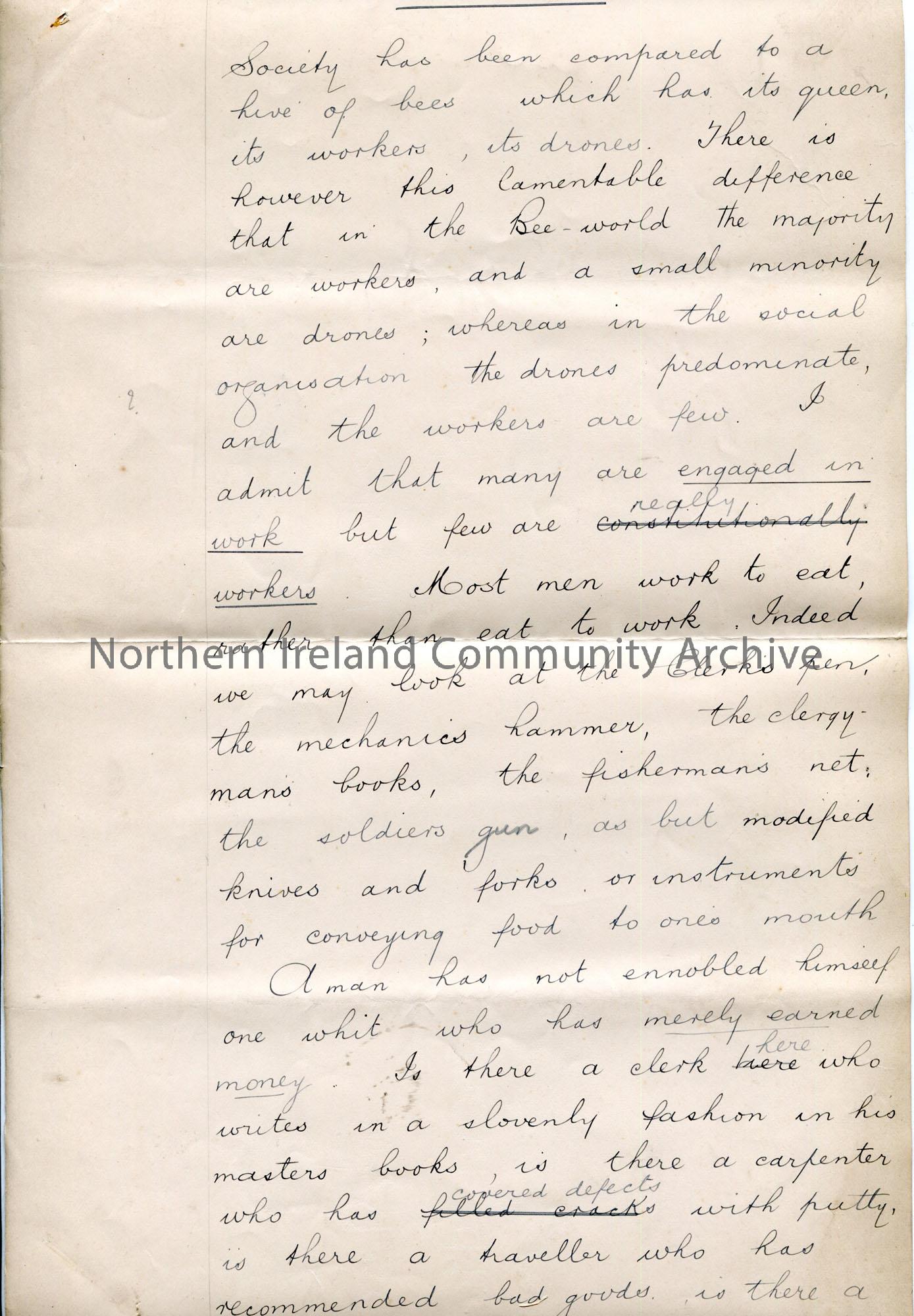 Page 1 of 9. Handwritten essay possibly for lecture titled, 'The Shirker' by Sam Henry. Appears to address the 'Association' New Row? Refers to the town of Coleraine. Asks people if they are workers or shirkers. Encourages people to be proactive in their work and lives.