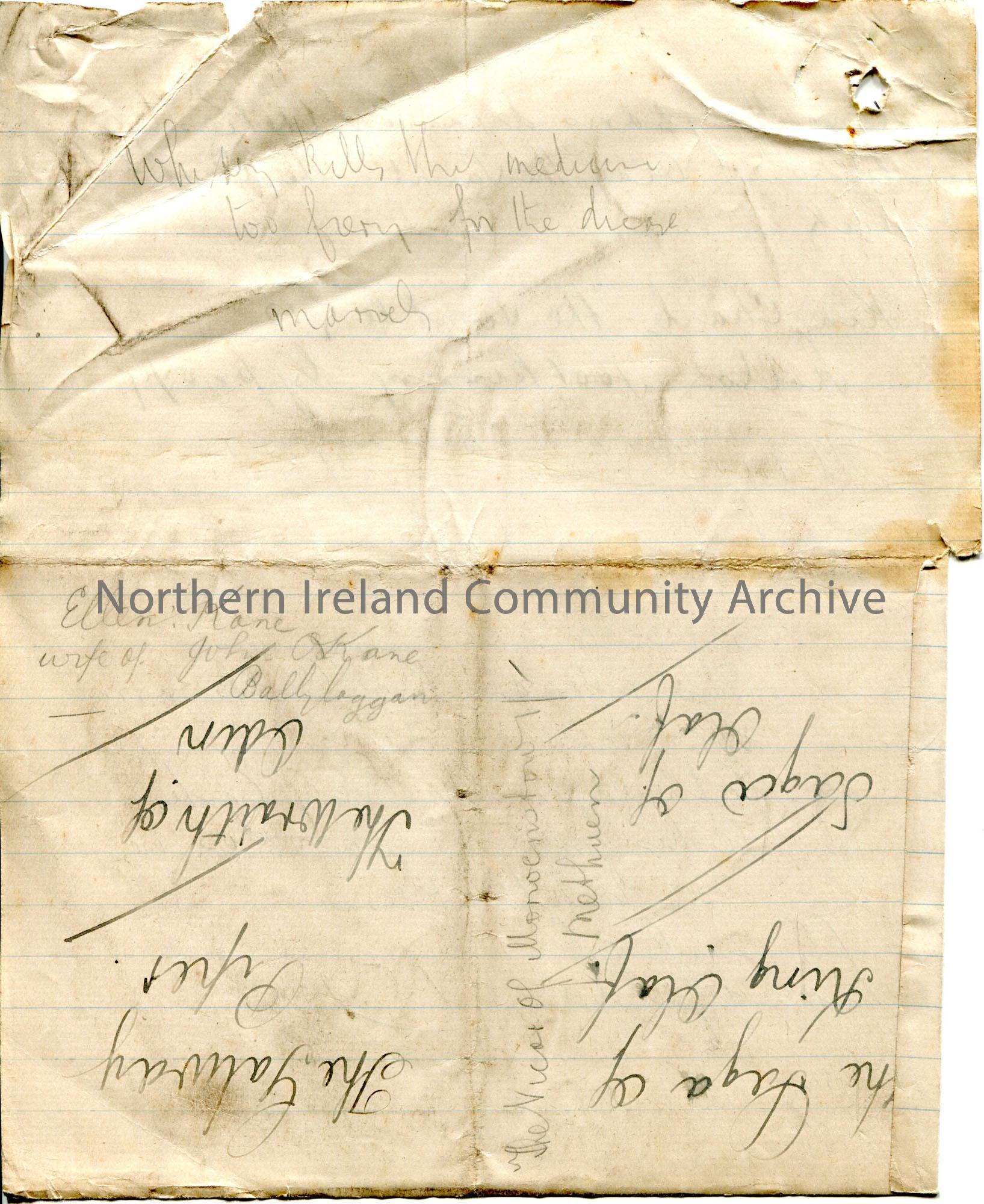 Page 10 of 10. Handwritten essay and rough notes. Title scored out ‘The Wrath of Odin’. Re the origin and history of Odin in the understanding the mea… – scan021k