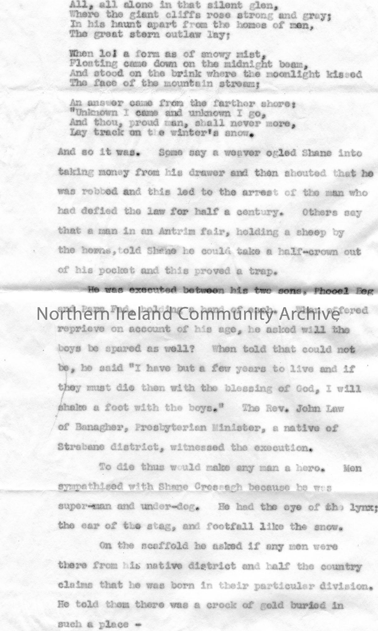 Page 10 of 11 typed script for broadcast titled, 'Irish Highwaymen and Tories. Shane Crossagh'. By Sam Henry. Saturday 26th February 7.5 - 7.20pm. Various stories involving Shane Crossagh - the Derry Rapparee.