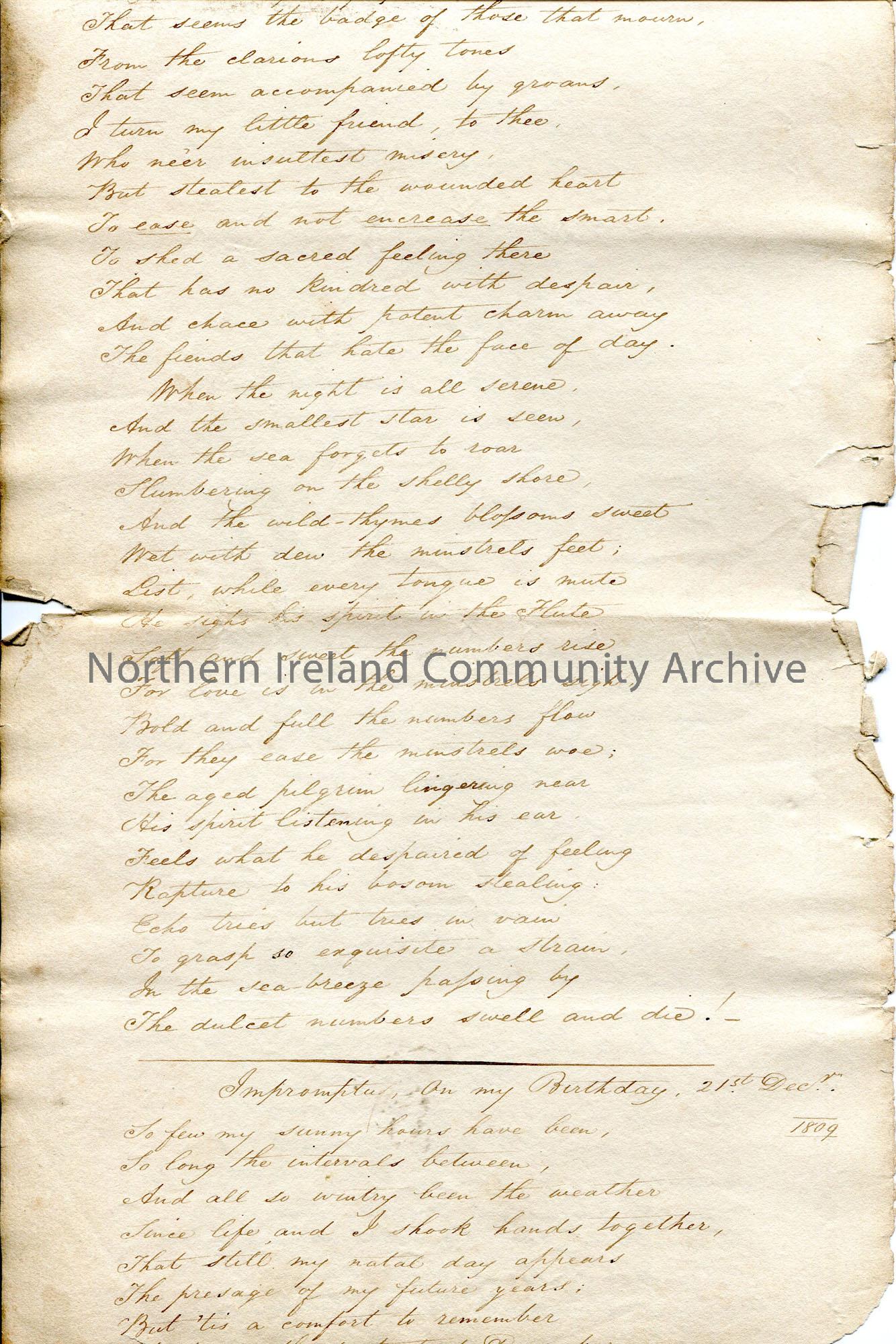 Page 10 of 12. Handwritten verses of poetry. Some of which are untitled. Titled pieces - 'The Emigration', 'L'Amour' Translated from the French 1814, 'The Shift' 1812, 'The Stranger-Hound. A Dunmull Legend' 1812, 'Impromptu, On my Birthday' 21st December 1809, 'To My Flute' 1807, 'Prologue to Speed the Plough' 1806 and 'Occasional Address. Spoken at the opening of the private theatre, Colerain' 1806.
