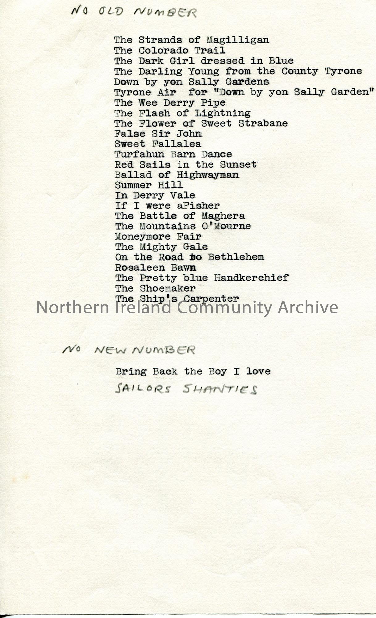 Page 10 of 19. Typed list of songs under heading handwritten in pencil ‘No Old Number’.