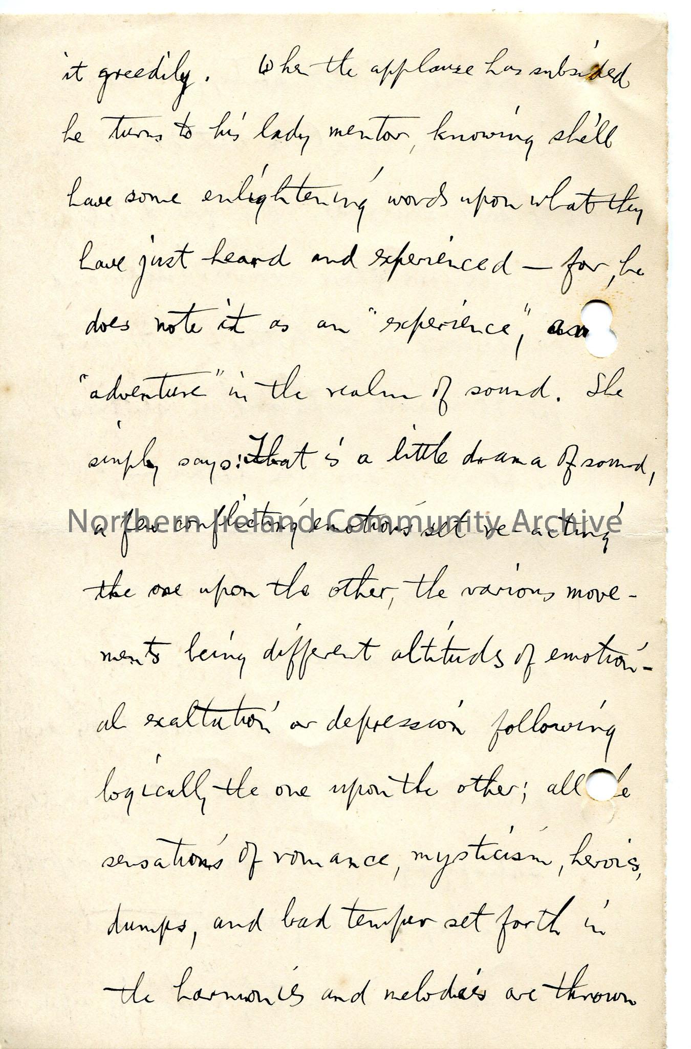 Page 10 of 24 page handwritten letter, on both sides of paper - author appears to have left Coleraine and now live in Glasgow. Mentions Irish Society School. Writes about classical music, Ibsen plays, a fanciful sketch his own, and Irish theatre, writers and myths and legends.