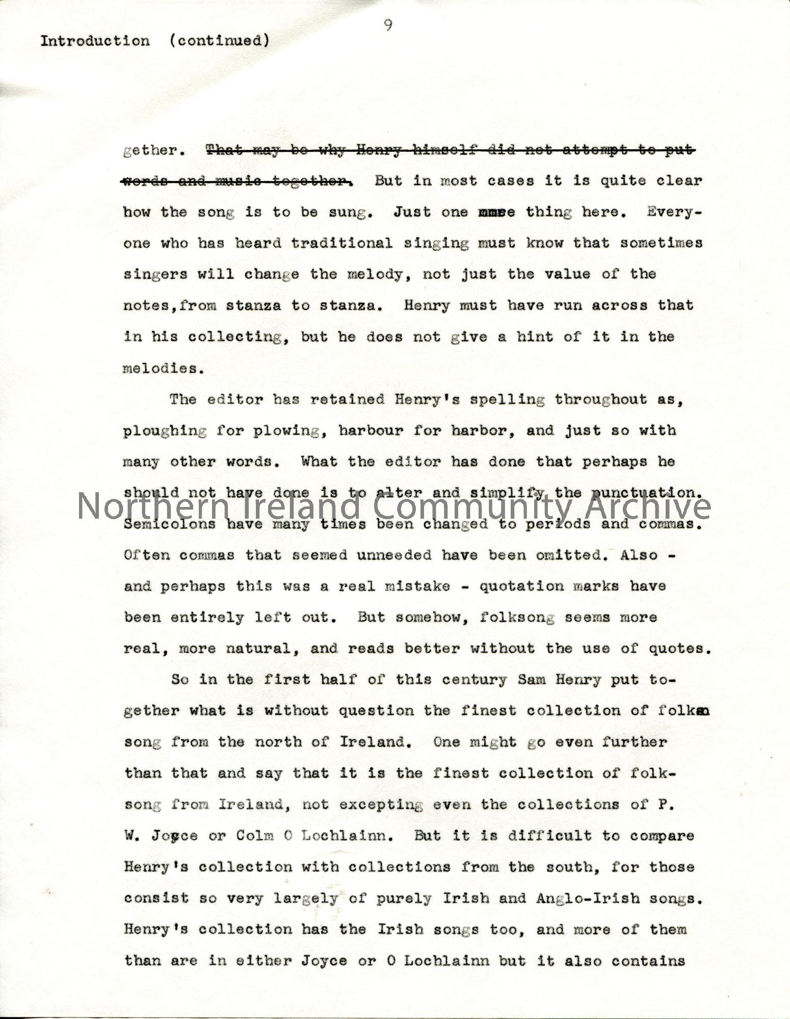 Page 10 of 28. Typed manuscript for Sam Henry's Songs of the People edited by Gale Huntington. Annotated in black ink. Includes the introduction, text re Child Ballads, Laws Ballads, Other Ballads, Songs and Ballad-Like Songs, Chanteys, Lullabys and Signing Games, Bibliography and Index.