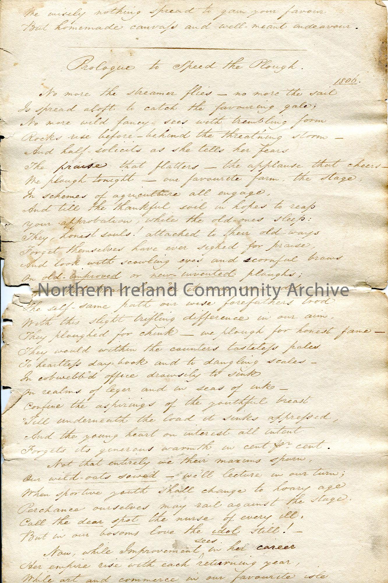 Page 11 of 12. Handwritten verses of poetry. Some of which are untitled. Titled pieces - 'The Emigration', 'L'Amour' Translated from the French 1814, 'The Shift' 1812, 'The Stranger-Hound. A Dunmull Legend' 1812, 'Impromptu, On my Birthday' 21st December 1809, 'To My Flute' 1807, 'Prologue to Speed the Plough' 1806 and 'Occasional Address. Spoken at the opening of the private theatre, Colerain' 1806.