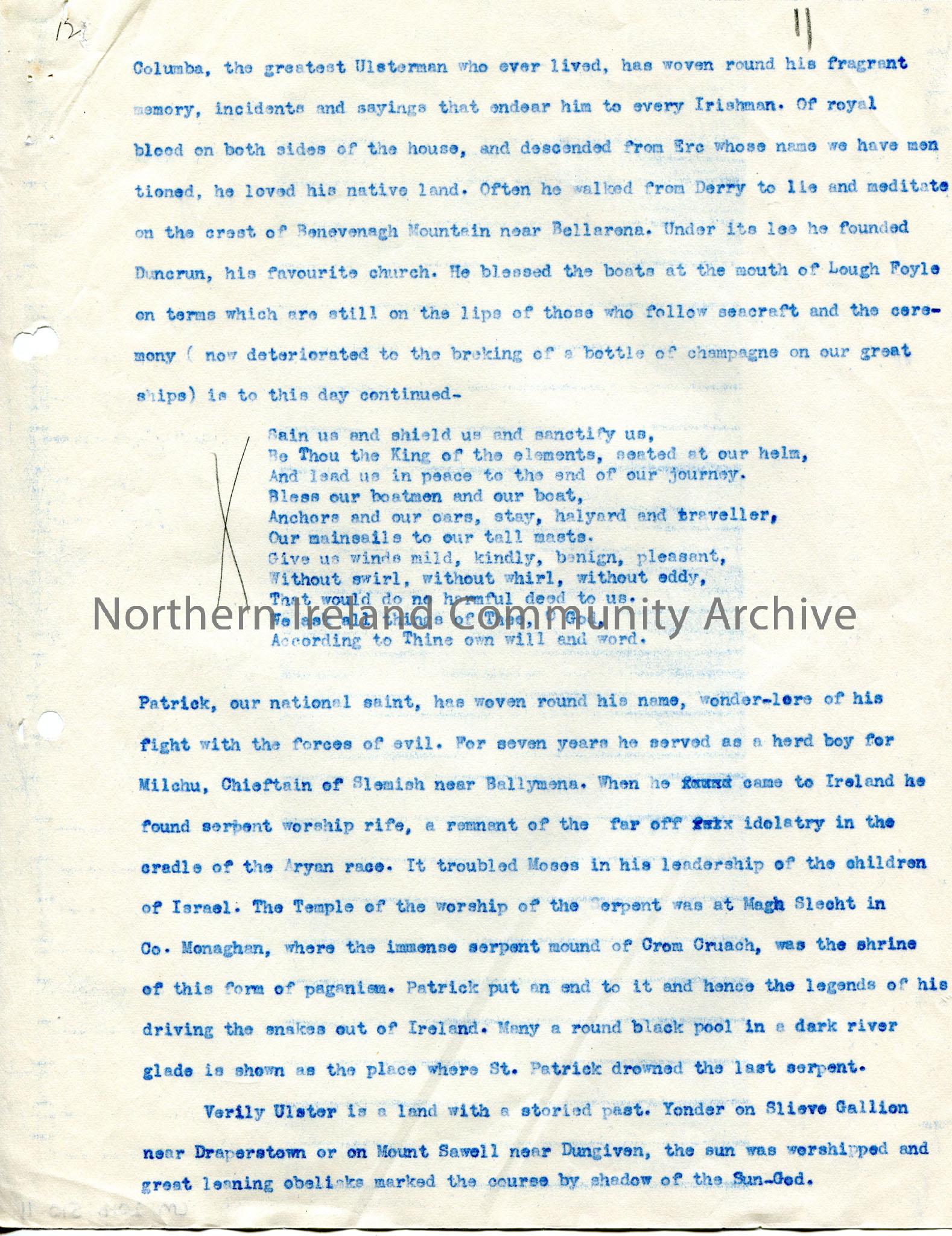 Page 11 of 13 of typed notes, possibly a script re tracing the evolution of the Irish people geologically. Mentions various people and places in Ireland. Pages numbered in pencil. Annotated in pencil throughout pages.