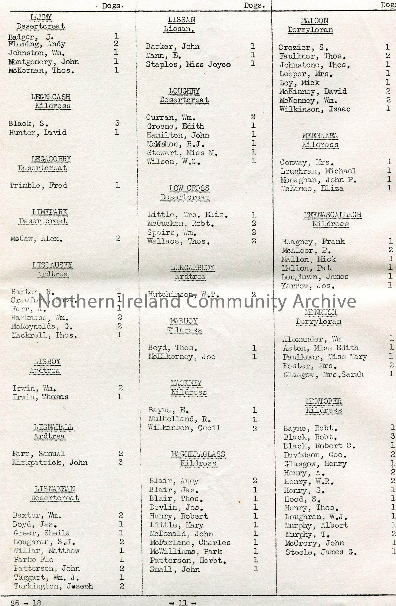 Page 11 of 14. Dogs Regulation (Ireland) ACTS, 1865 & 1919. Typed list of persons who have taken out licences in Cookstown in the County of Tyrone. Ye…