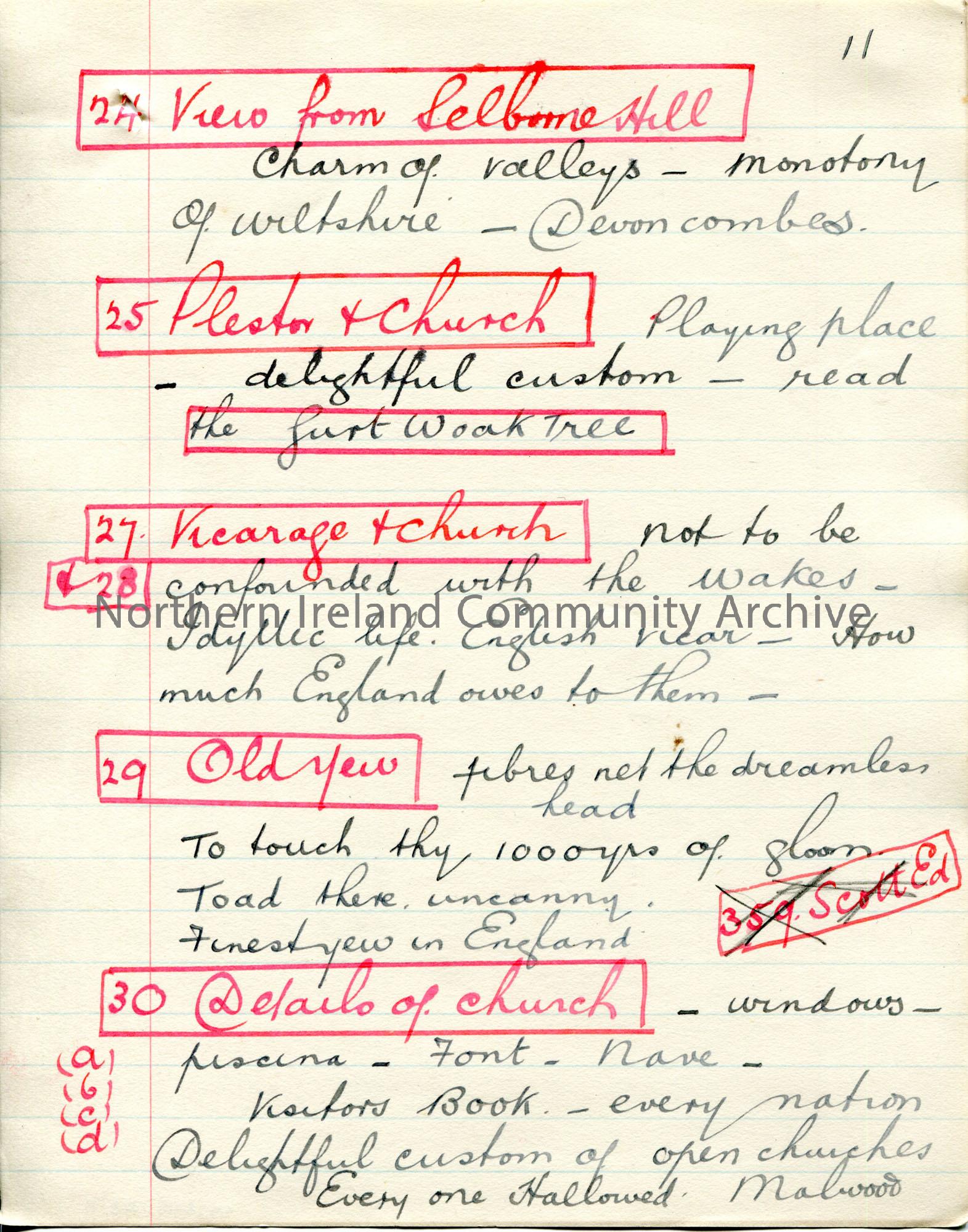 Page 11 of 15. Handwritten essay by Sam Henry titled, 'Gilbert White of Selborne'. [Hampshire, England]. Sam recounts a visit to Selborne with his brother. Interspersed with numbered titled of possibly images/slides.
