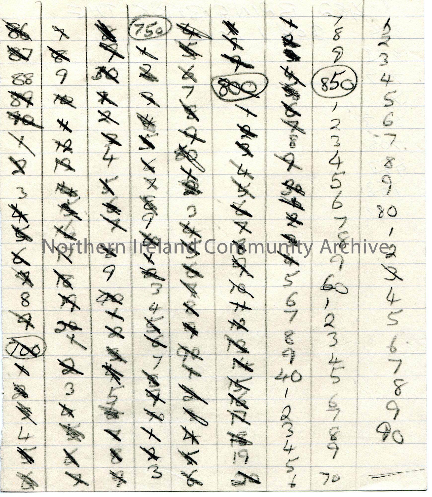 Page 11 of 19. Handwritten lists of song numbers in pencil, some are scored out. Handwritten list of songs on other side of page headed ‘No New Number…