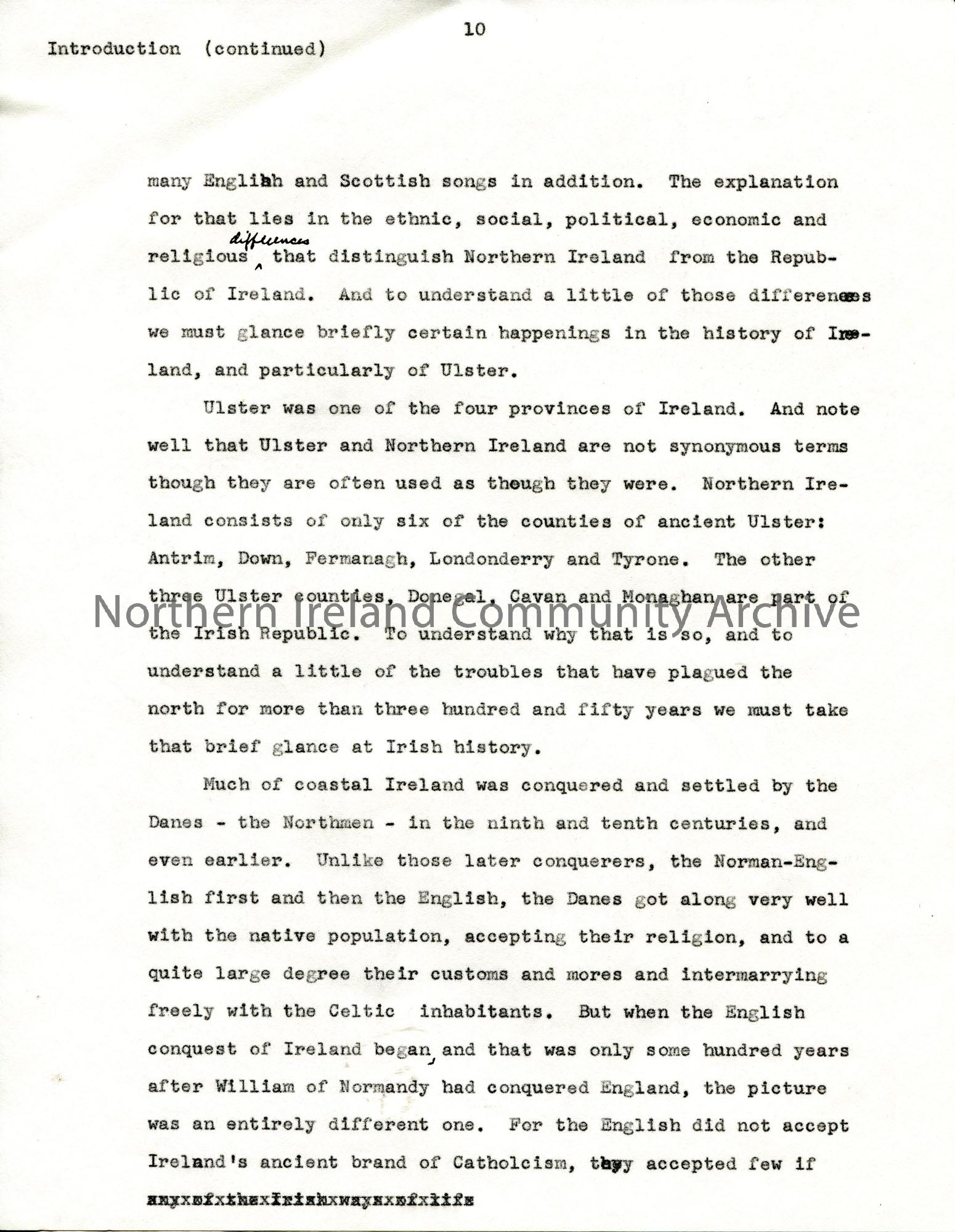 Page 11 of 28. Typed manuscript for Sam Henry's Songs of the People edited by Gale Huntington. Annotated in black ink. Includes the introduction, text re Child Ballads, Laws Ballads, Other Ballads, Songs and Ballad-Like Songs, Chanteys, Lullabys and Signing Games, Bibliography and Index.