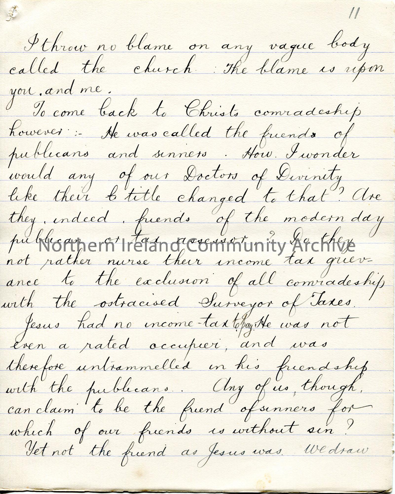 Page 11 of 38. Handwritten essay by Sam Henry titled, 'The Voice from the Ground'. 'Essay - Handshake' written in pencil above title. Re comradeship and Sam's encounters with various people. Contains rough notes on back of some pages of responses to the essay.