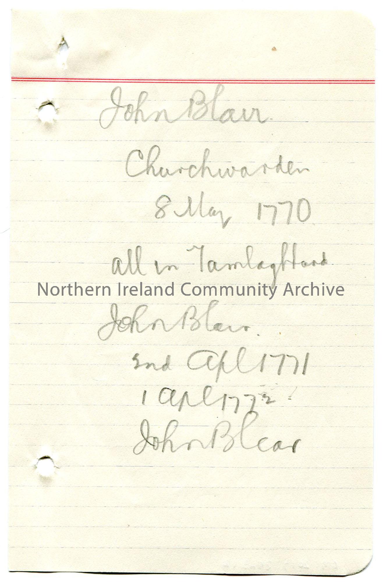 Page 12 of 15. Rough genealogical notes on lined paper in pencil from a notebook re Sam’s ‘Blair Inquiry’. Mentions Hugh Blair and John Blair. ‘Record…