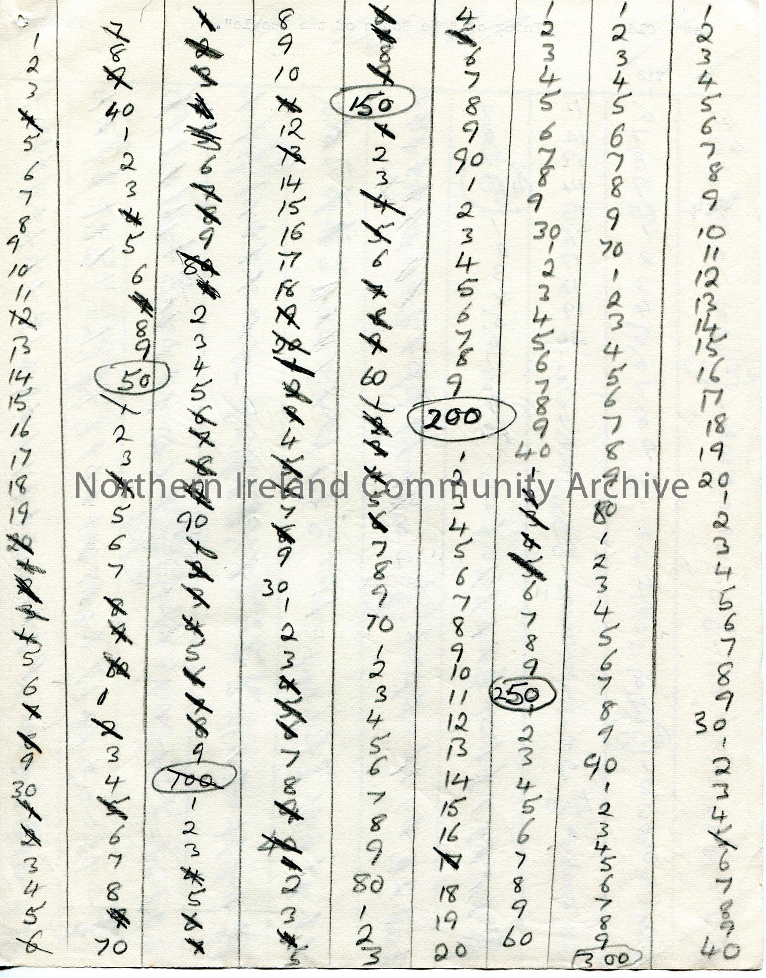 Page 12 of 19. Handwritten list of song numbers on both sides of page. Some are scored out or circled.