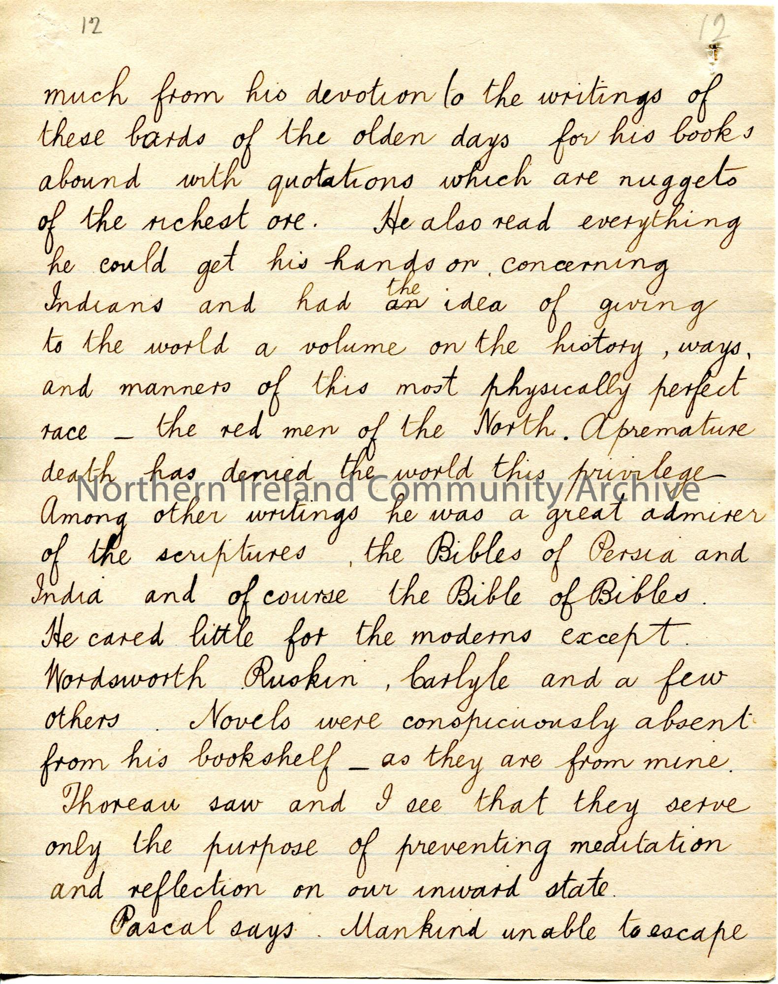 Page 12 of 38. Handwritten essay by Sam Henry titled, 'The Hermit of Walden'. Philosophical essay re Henry David Thoreau. Sam presents this essay to the 'Association'.