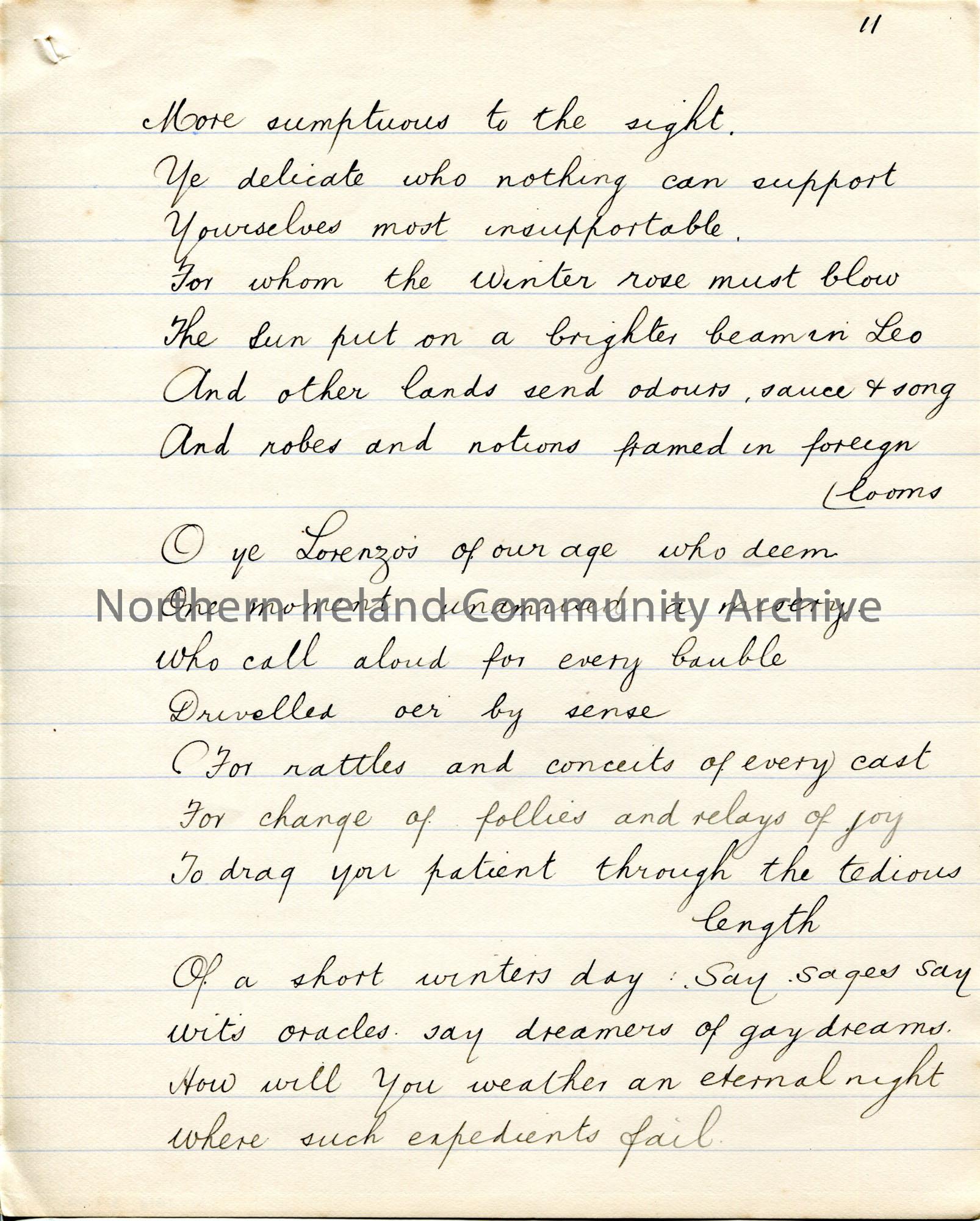 Page 12 of 39. Handwritten essay by Sam Henry titled, 'The Cult of Comfort'. Title is scored out. Dated Omagh, December 1905. Religious, philosophical essay discussing happiness, comfort, charity, love. Includes various songs and poems. Discusses classes, rich and poor.
