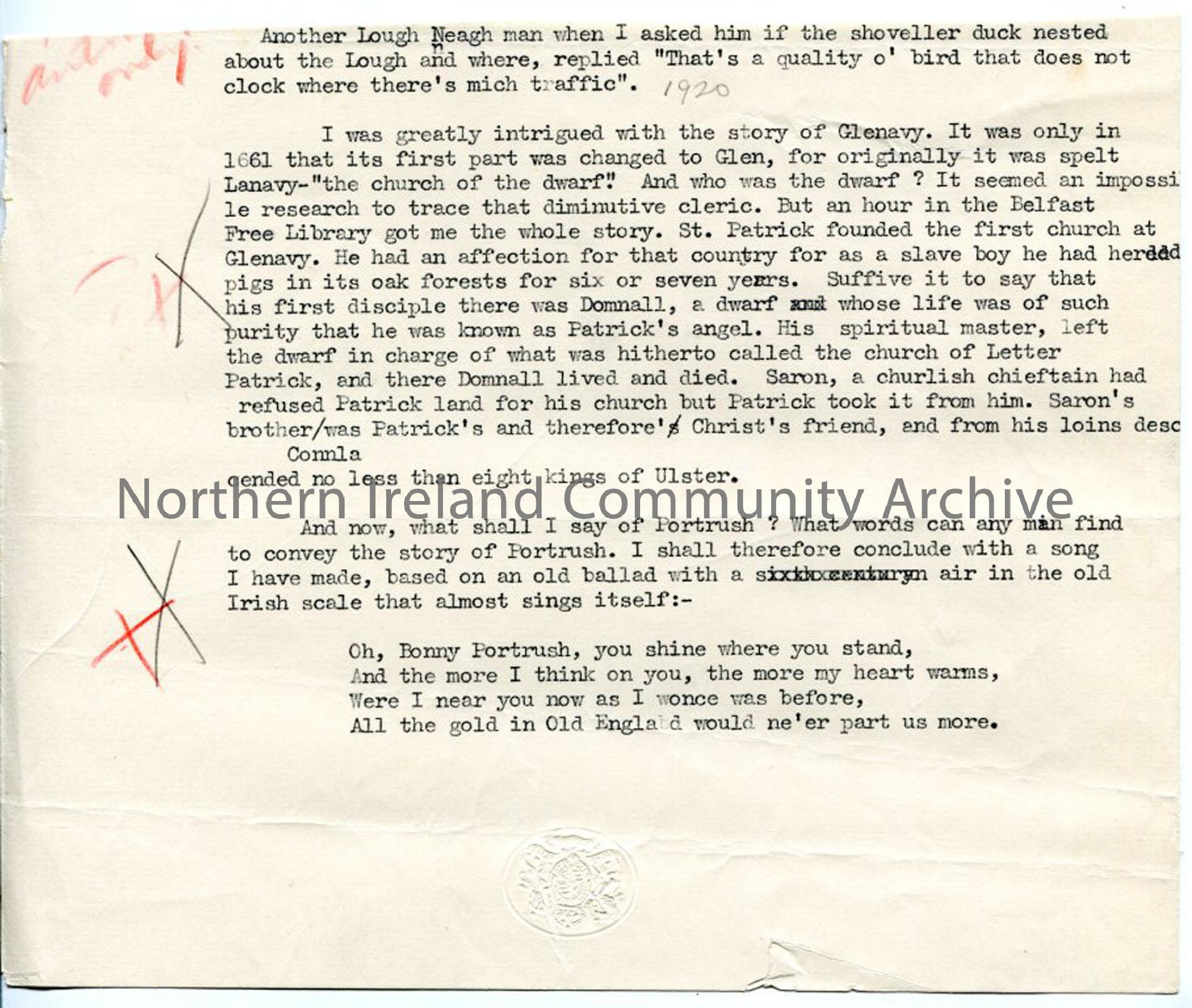 Page 13 of 13 pages of typed script, with handwritten corrections, under heading 'Undiscovered Ulster - Co. Antrim'. Some information is repeated - possibly a mixture of 2 scripts. Includes close relationship between North Antrim and Hebrides, with Islay funerals taking place in Dunseverick. Last 3 pages have heading 'Additional notes to be worked in to script'. Descriptive historical trip through various locations in County Antrim, with factual and folklore stories and customs.