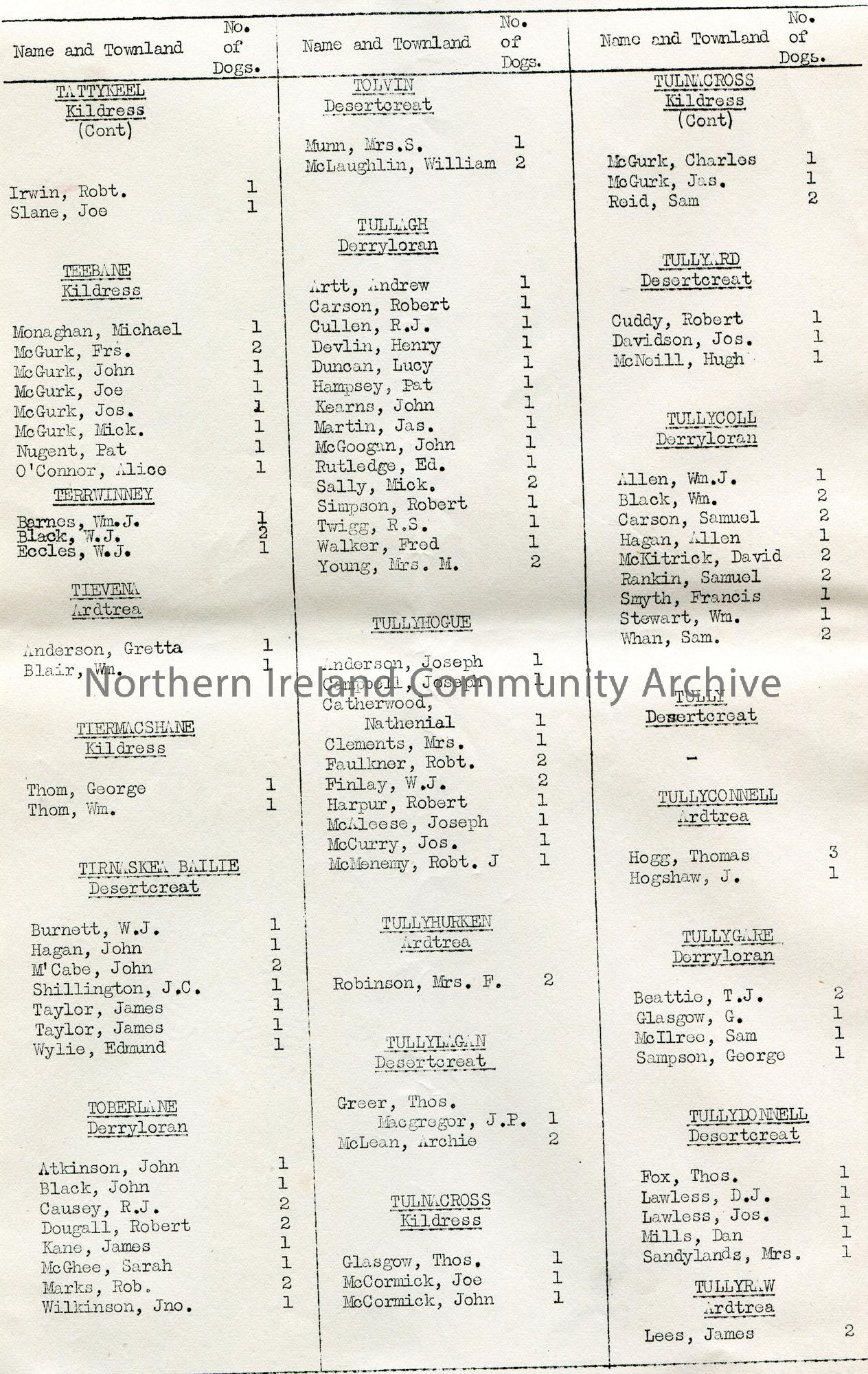 Page 13 of 14. Dogs Regulation (Ireland) ACTS, 1865 & 1919. Typed list of persons who have taken out licences in Cookstown in the County of Tyrone. Ye…