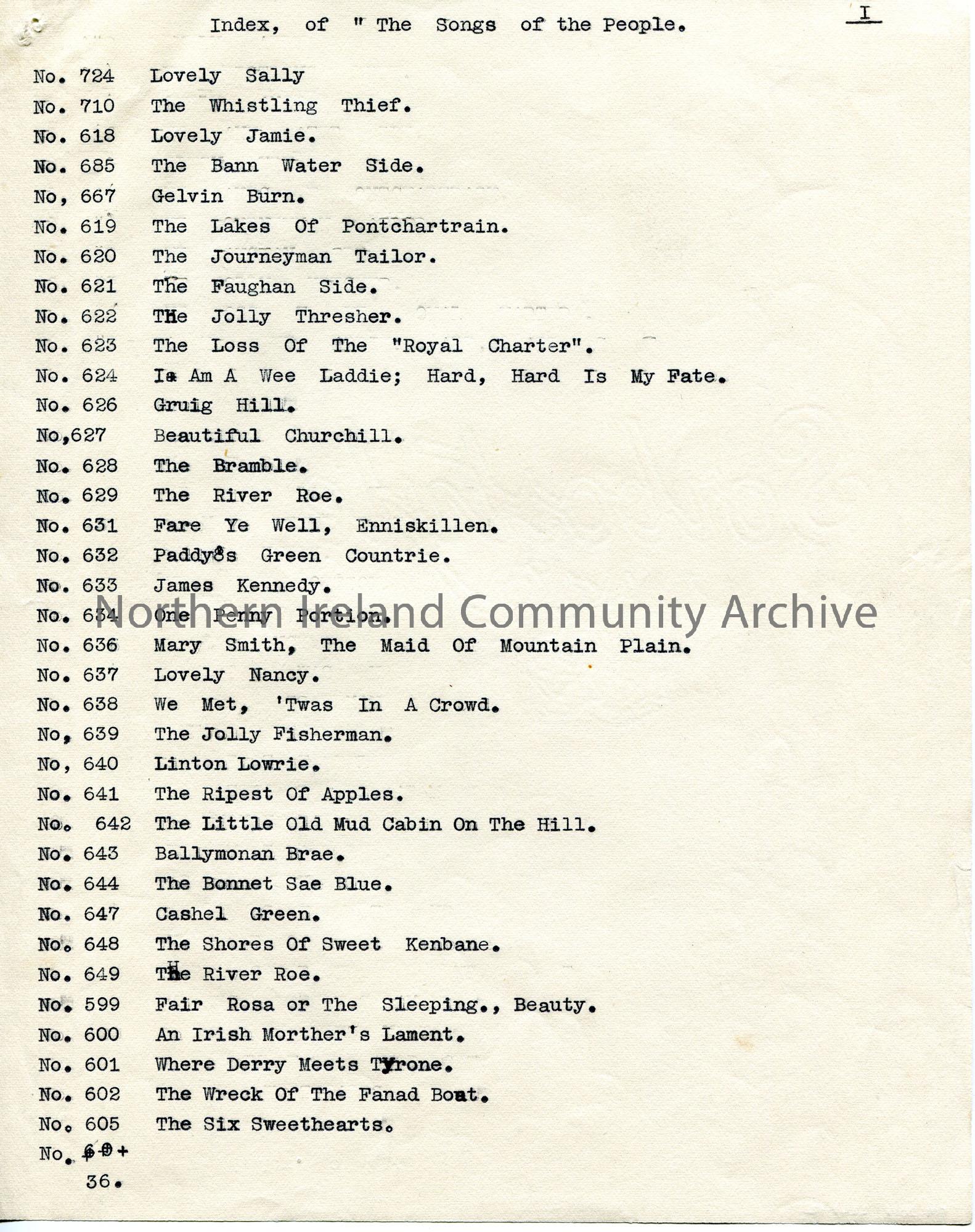 Page 13 of 19. Typed list of song numbers and song names titled, ‘Index of “Songs of the People”‘. Page 1.
