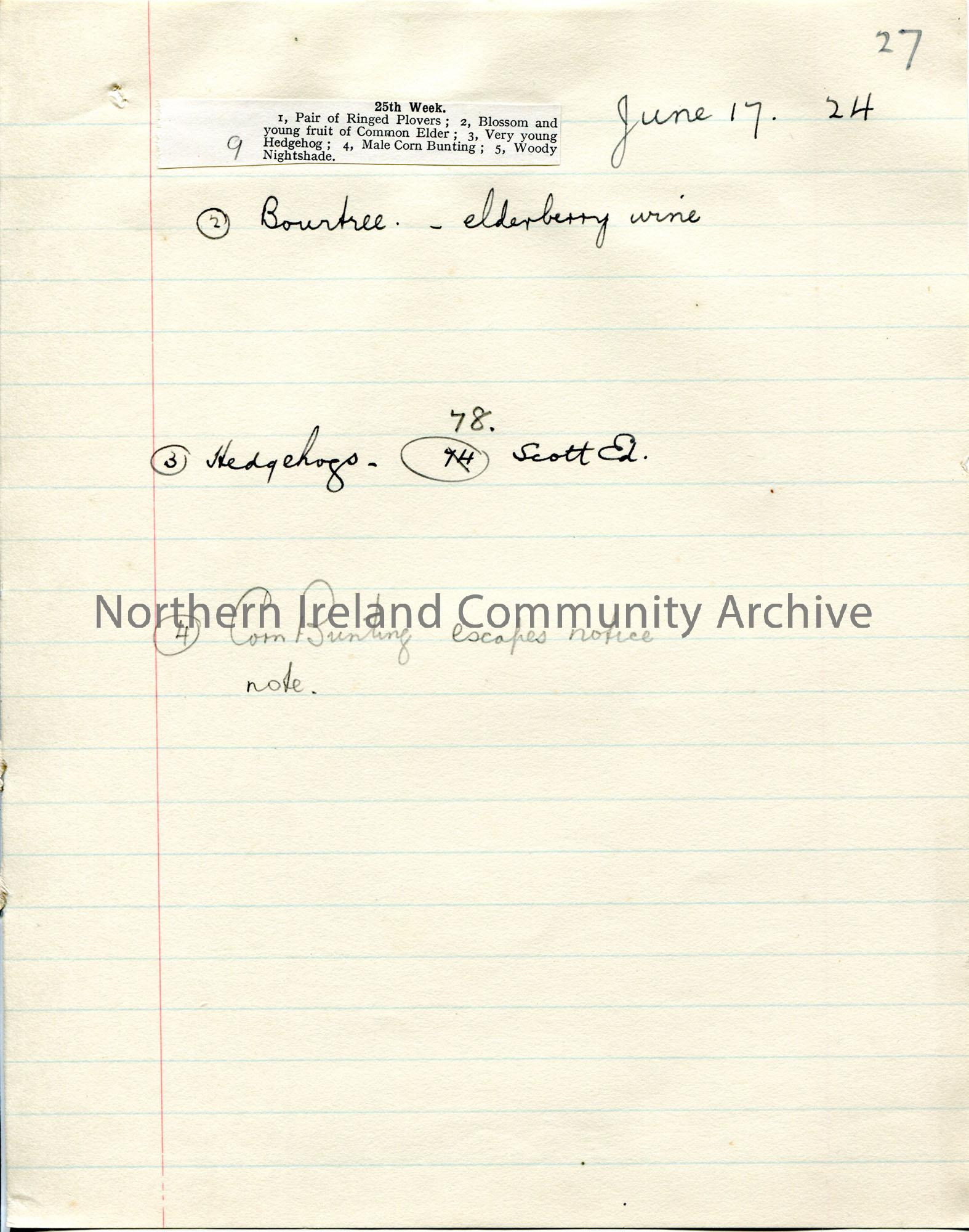 Page 13 of 26. Handwritten nature notes (double sided). Details correspond to each week of the year. Small cuttings from a publication are pasted to s…