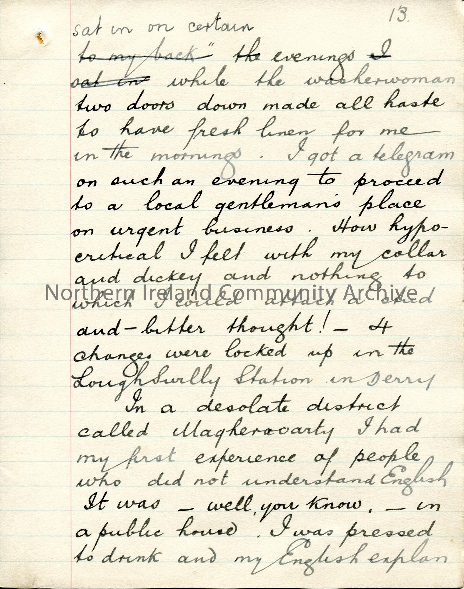 Page 13 of 71. Handwritten, rough essay [ for a talk? ] by Sam Henry titled 'Here and There in the King's Service'. Dated 1909 by JM. Sam Henry talks through his first 15 years of service as an Exciseman. He was based at Falcarragh, Ballymote in Co. Sligo, Lancashire, Uffculme and Omagh in Co. Tyrone.