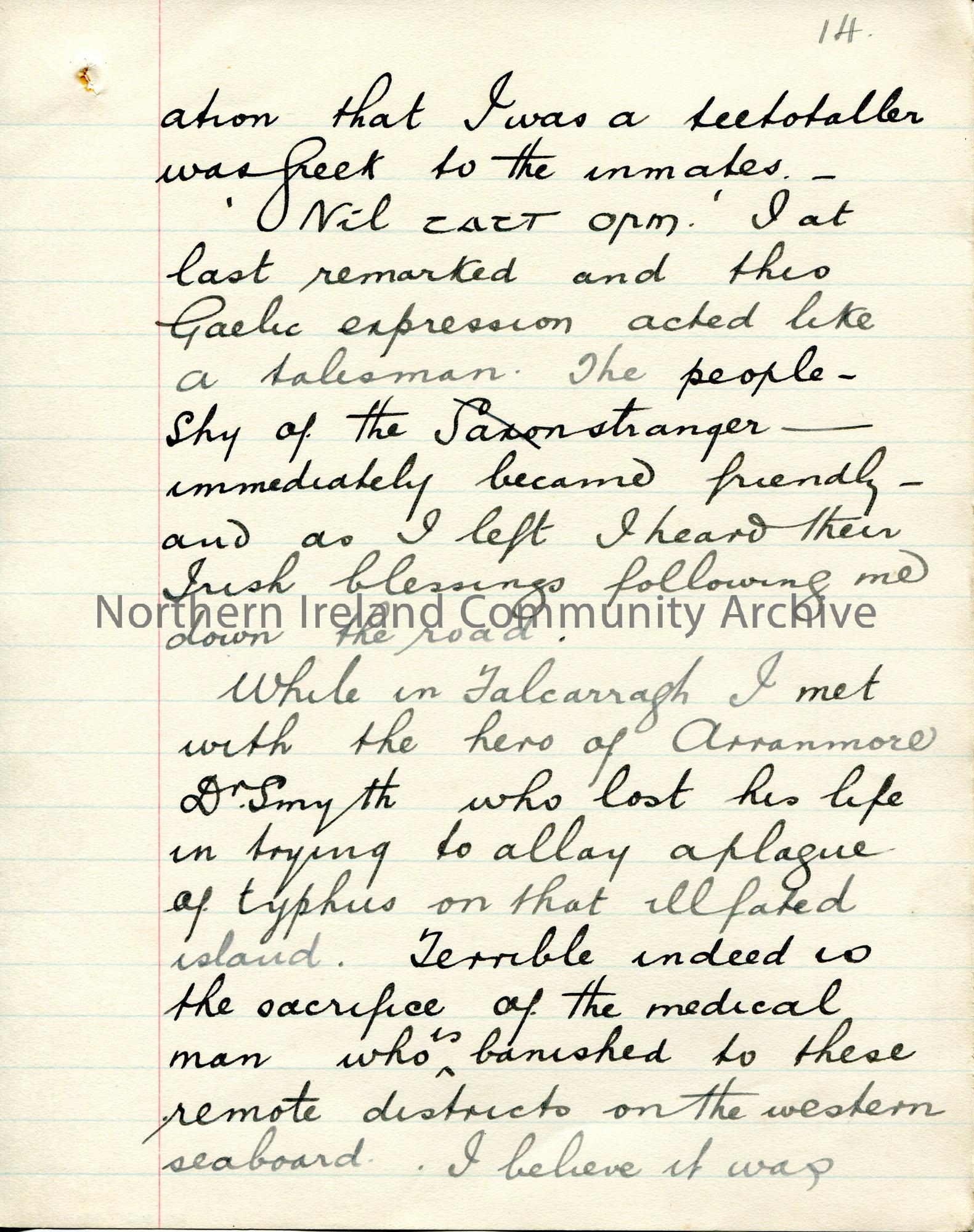 Page 14 of 71. Handwritten, rough essay [ for a talk? ] by Sam Henry titled 'Here and There in the King's Service'. Dated 1909 by JM. Sam Henry talks through his first 15 years of service as an Exciseman. He was based at Falcarragh, Ballymote in Co. Sligo, Lancashire, Uffculme and Omagh in Co. Tyrone.
